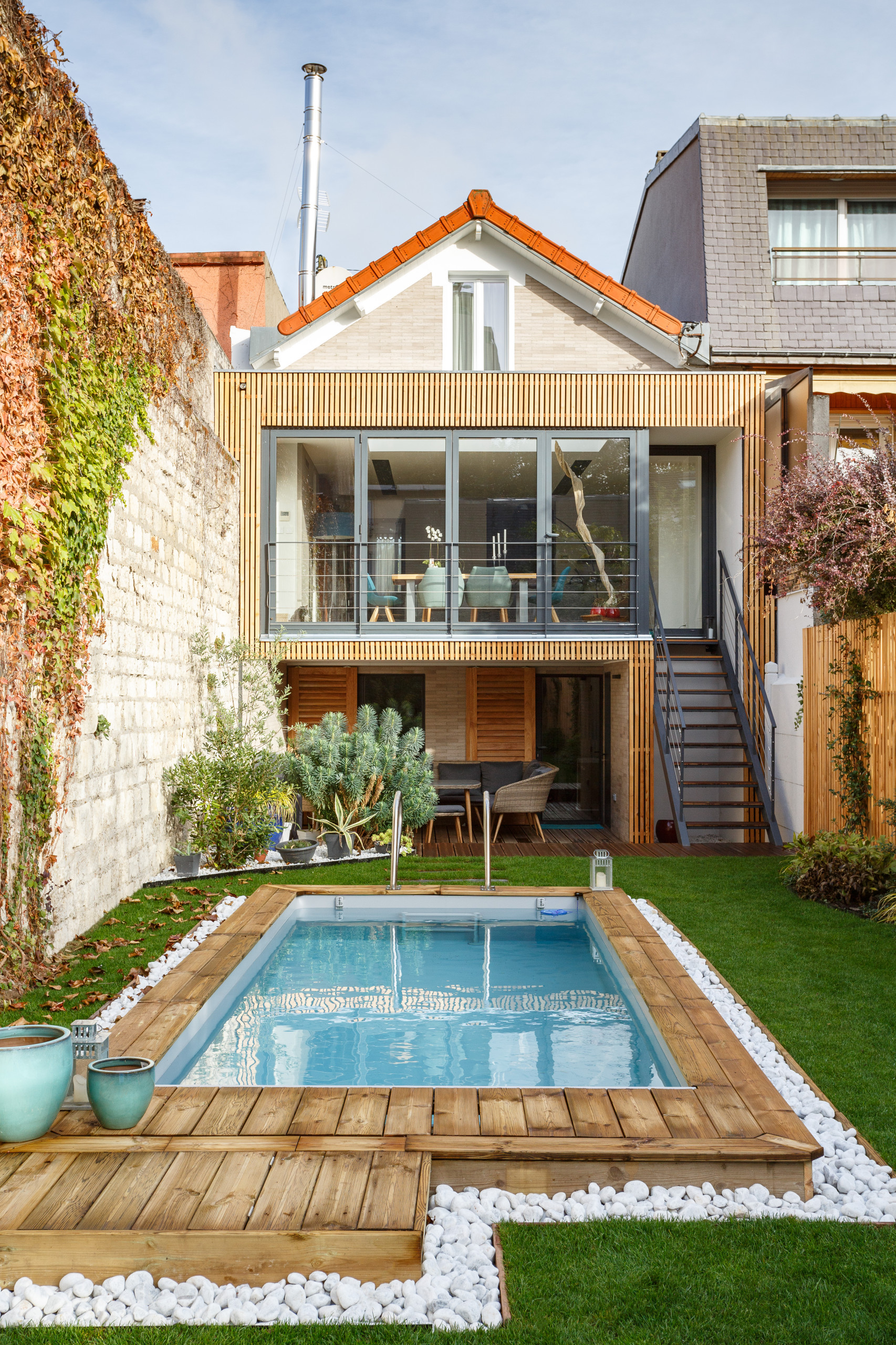 Après. À voir aujourd’hui cette façade arrière bardée de tasseaux de mélèze, cette piscine dans ce jardin paysager, nous peinons à imaginer les efforts qu’il a fallu aux propriétaires et à leur architecte pour en arriver là. Bardage, réfection de la terrasse, pose des volets et piscine ne sont intervenus qu’à la toute fin du chantier, l’été dernier. Avant de parvenir à ces belles finitions, la route d’une rénovation en profondeur a été longue.