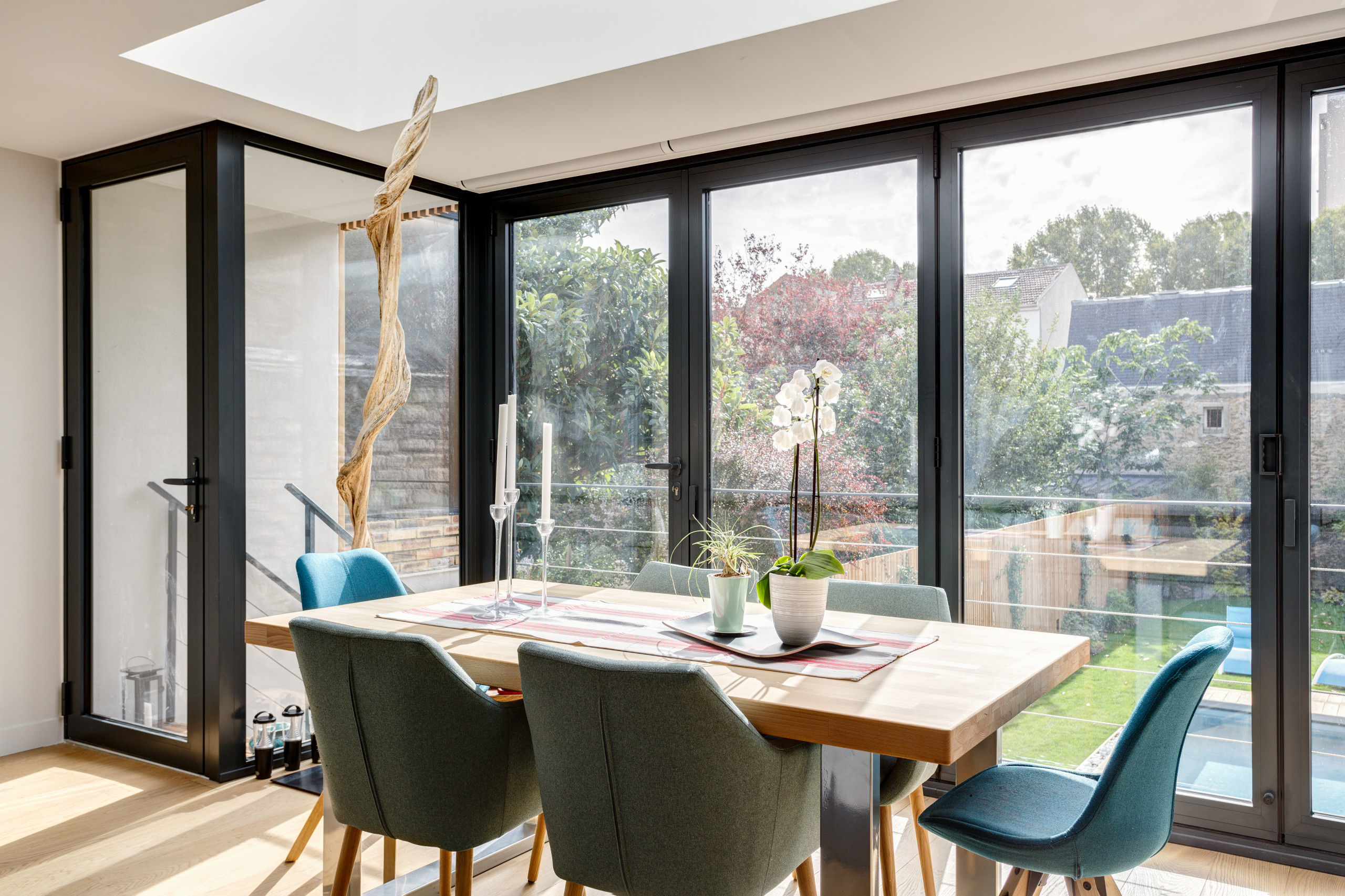 Après. Émilie a fait poser une nouvelle baie pliable réalisée sur mesure. « C’est un modèle performant thermiquement, en alu avec double vitrage et contrôle solaire, car la baie est située plein sud. Nous avons ajouté des stores, qui ont été placés discrètement dans les faux plafonds », explique-t-elle.