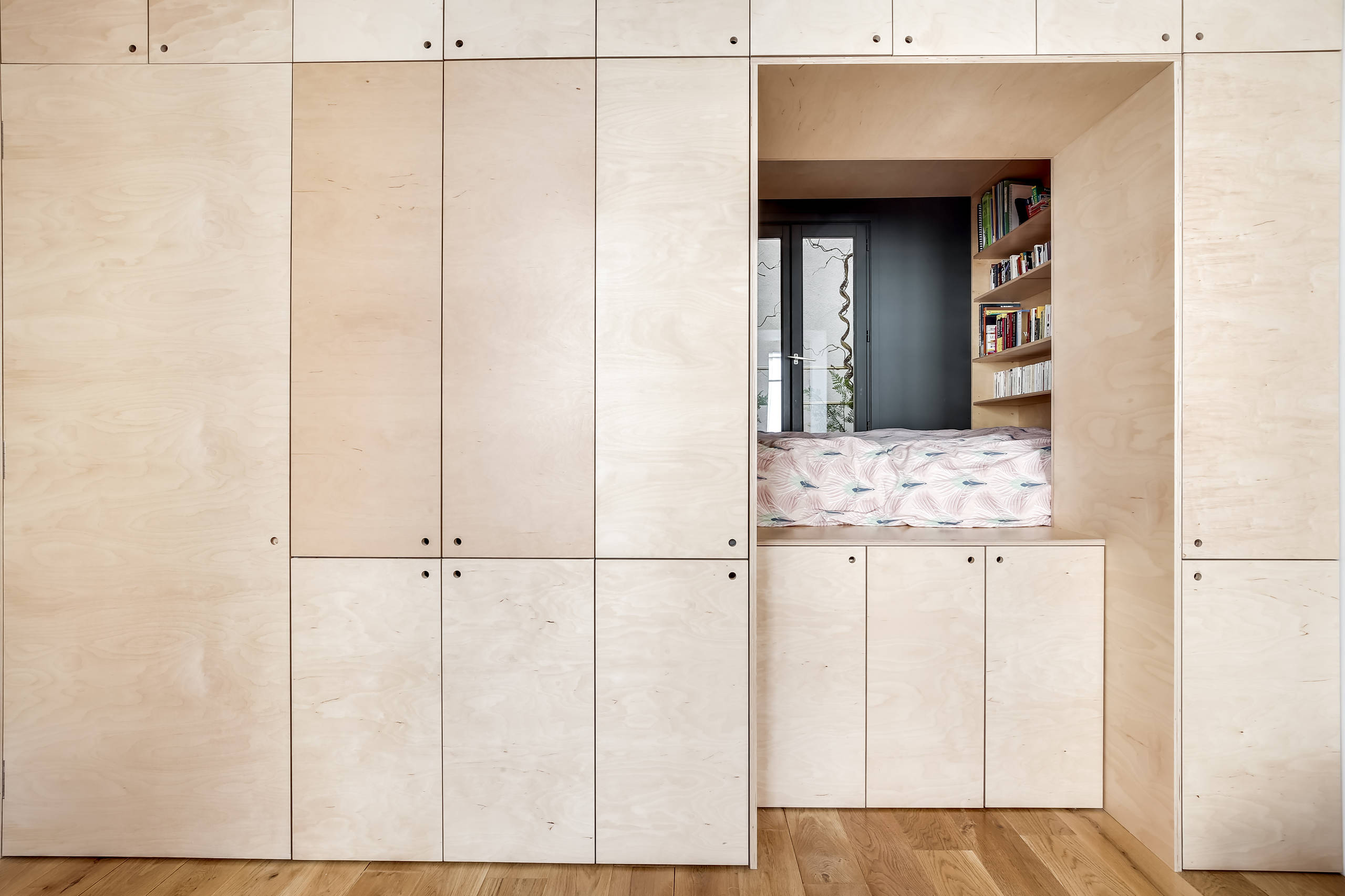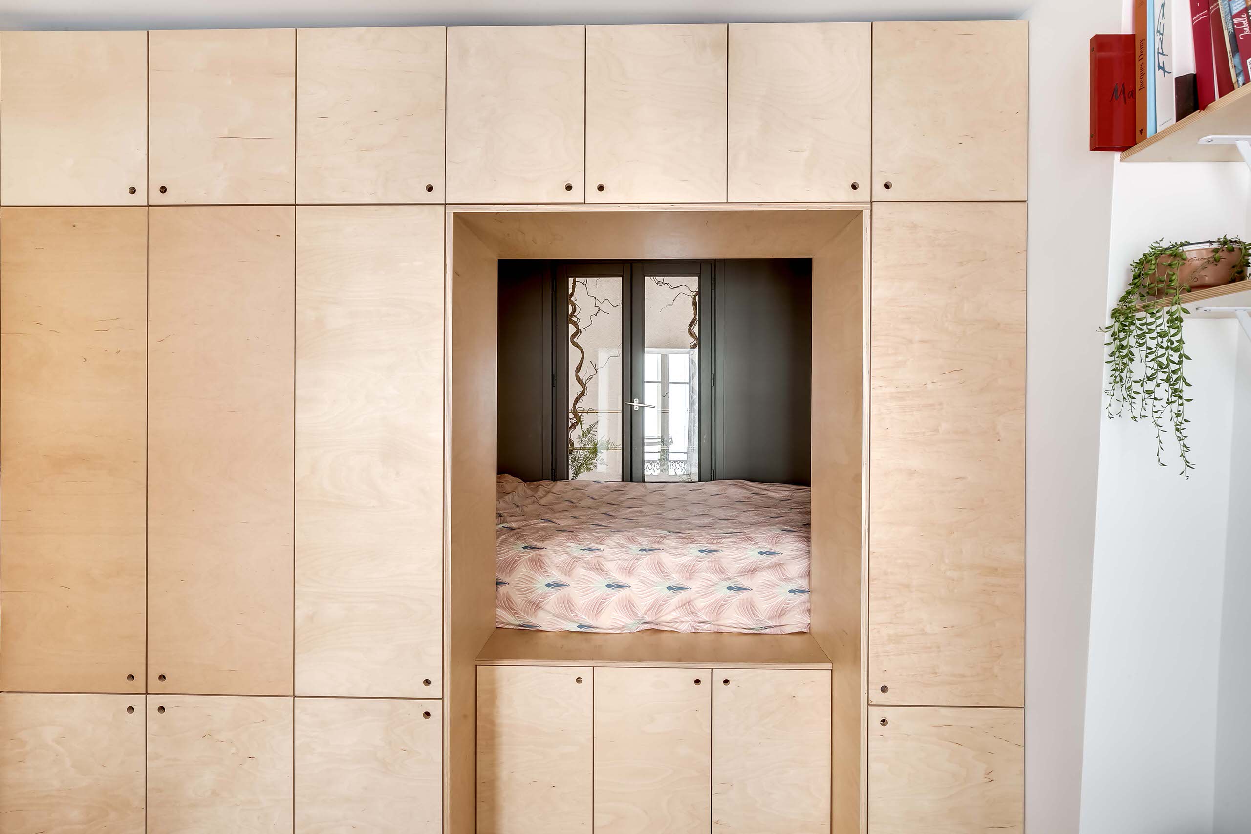 La niche boisée est très agréable car elle profite de la fenêtre de l’ancienne cuisine pour aérer et faire courant d’air avec les fenêtres de la pièce de vie. Un atout rare à Paris dans une si petite surface ! Comme le lit a été rehaussé de 70 cm, le matelas se trouve à ras de fenêtre. C’est pratique pour rejouer Fenêtre sur cour, mais un garde-corps extérieur a été ajouté pour la sécurité.