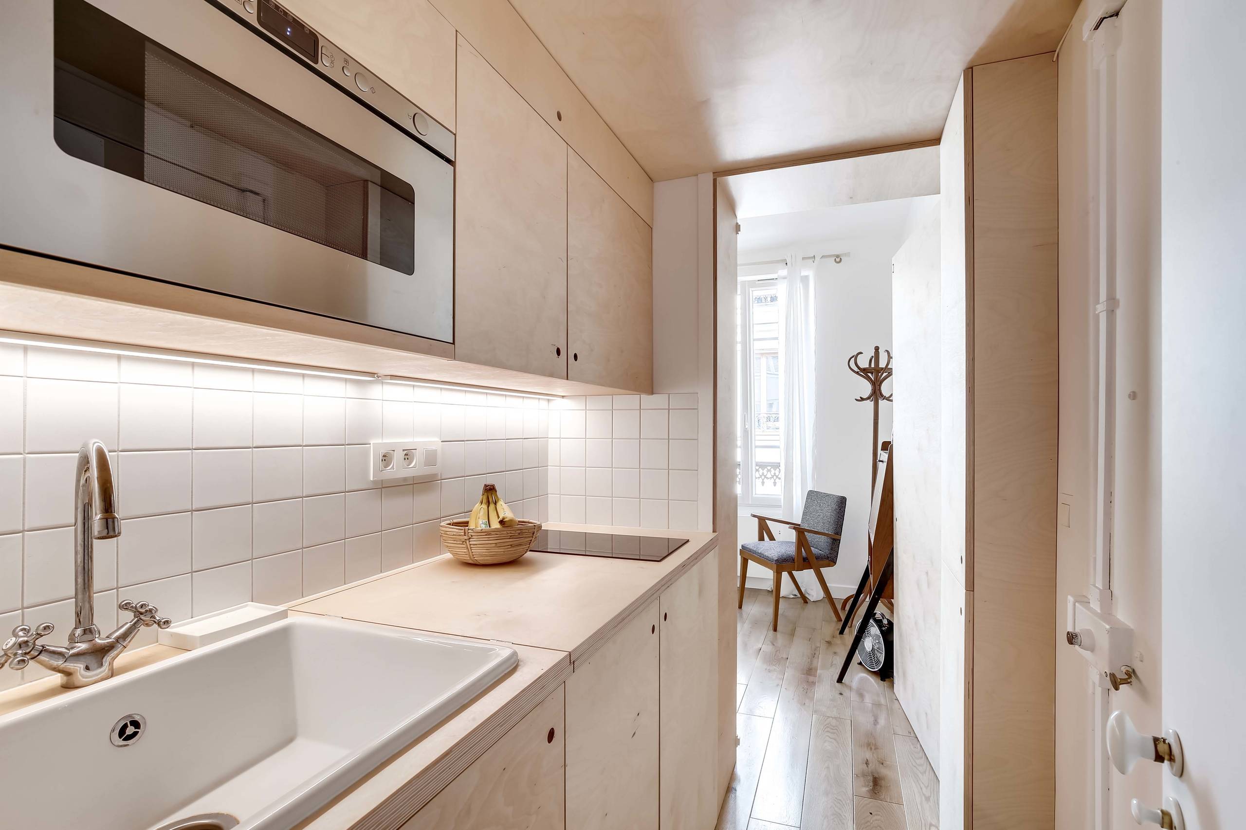 La cuisine a été réalisée en contreplaqué de bouleau — comme le reste des menuiseries. Protégés au vernis hydrofuge mat, les éléments renferment, en bas, un frigo, un lave-linge de 45, du rangement et une poubelle de tri et, en haut, un four combiné-micro-ondes, la hotte à recyclage et des placards de rangement. La crédence en carreaux de faïence 10 x 10 a été choisie pour sa simplicité et son graphisme. Face au linéaire, un placard dissimule le compteur électrique et sert de vestiaire d’entrée.