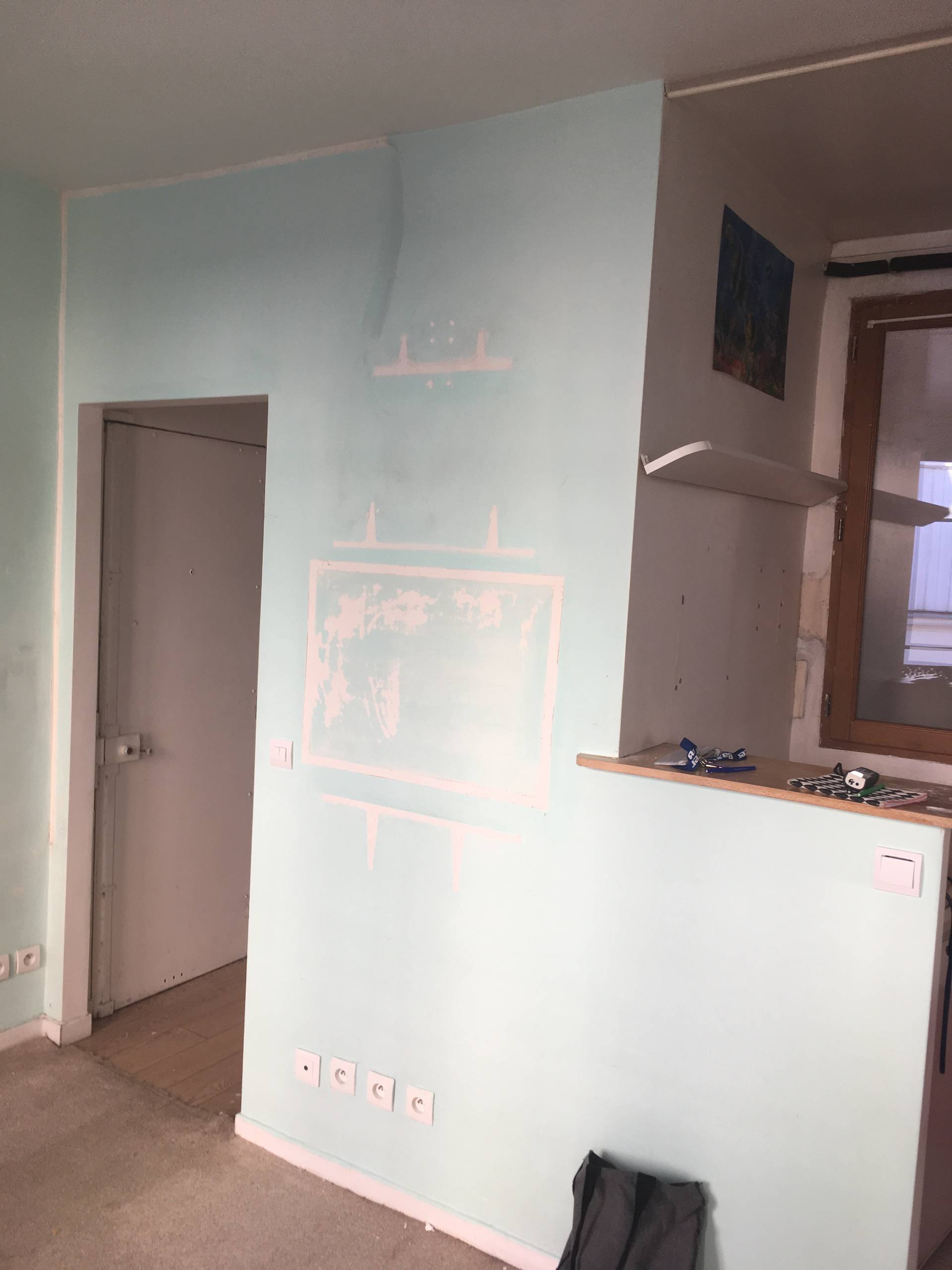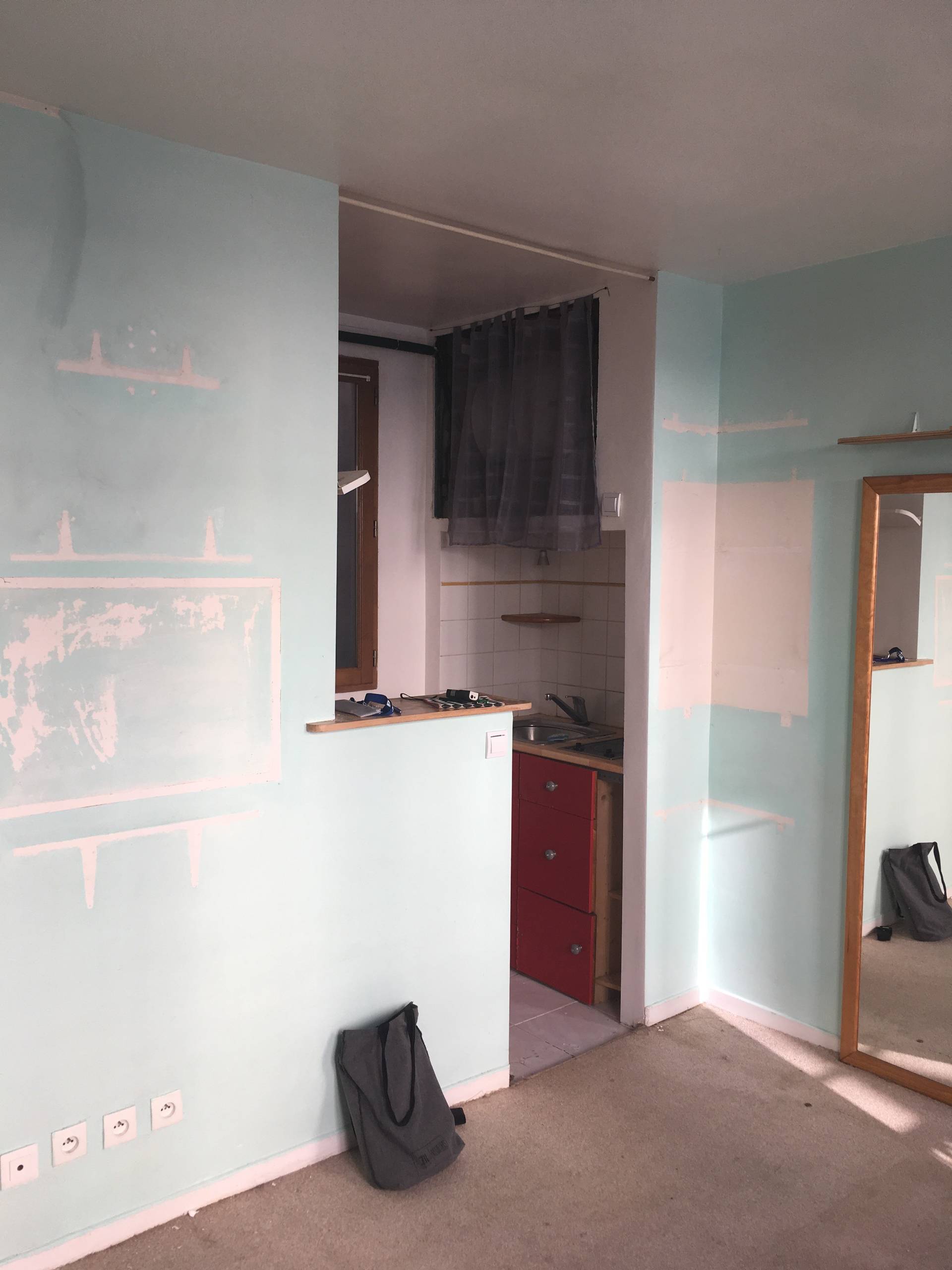 Avant. L’entrée se situe à droite sur le cliché. Derrière se trouvaient les toilettes, devant la pièce de vie et à gauche la douche. L’aménagement rappelait celui de certaines chambres de service mal optimisées : une barre placée juste sous l’interphone servait à poser sa serviette mouillée. C’était donc la première chose que l’on distinguait en entrant…