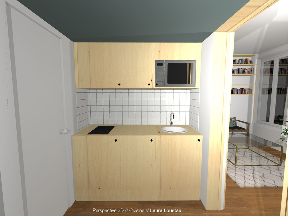 Après. Aménager moins de 20 m² en casant une vraie cuisine, une vraie chambre, un vrai séjour, une vraie salle d’eau tient toujours de la prouesse et par conséquent il fallait faire des choix engagés… Laura Loustau a fait celui de mettre la cuisine à l’entrée et s’en explique : « L’idée est venue du propriétaire lui-même qui m’a défiée de mettre la salle d’eau entière dans les toilettes. Ayant libéré l’entrée de la douche, j’ai pensé à créer un sas grâce à la cuisine afin de protéger l’espace de vie du bruit du couloir. »