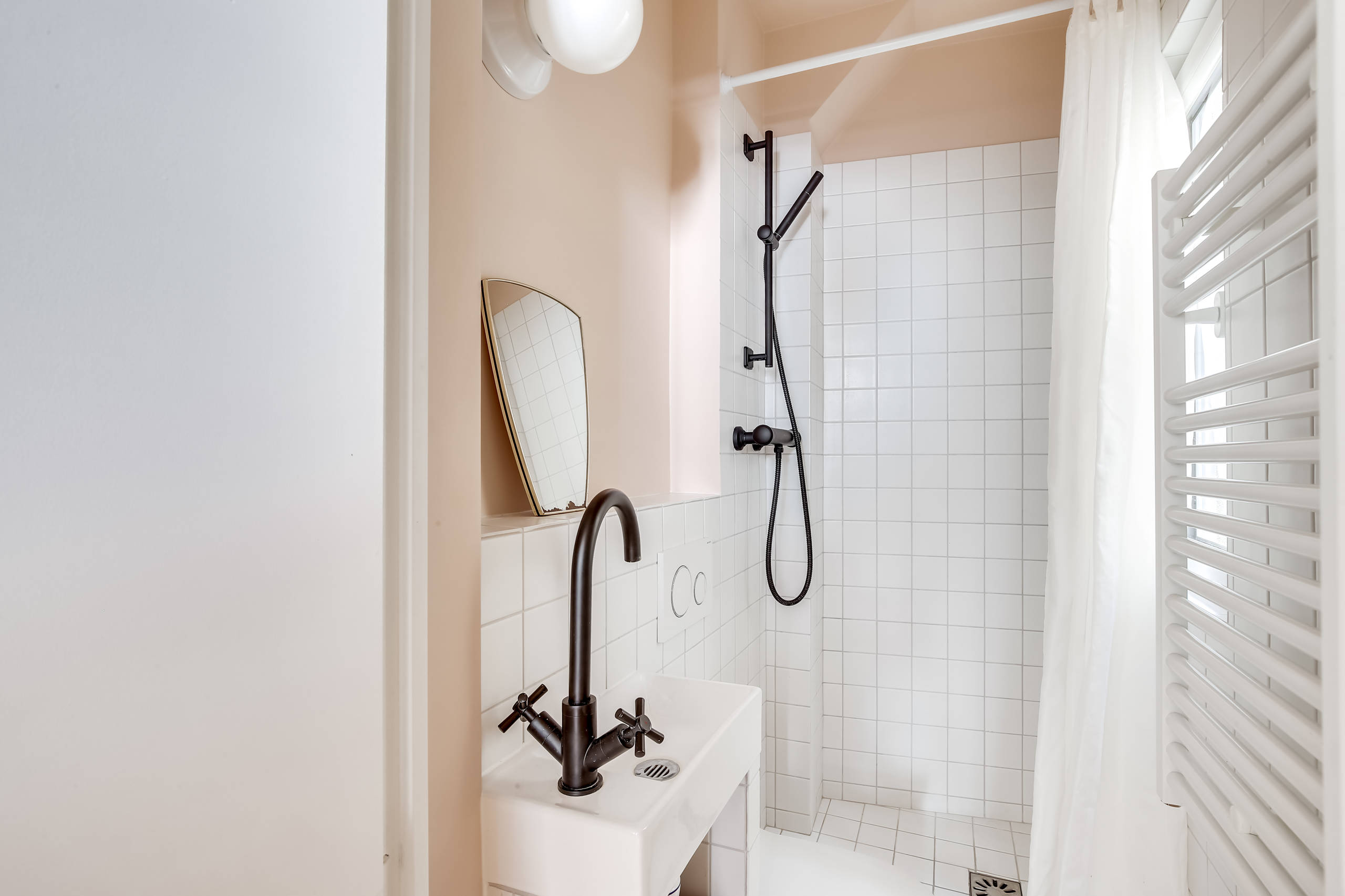 Une applique ronde (IP 45 spécial lieux humides) et un sèche-serviettes électrique, basique mais quand même plus contemporain que la précédente barre de douche, complètent l’ensemble et en font une salle de bains toute équipée.
