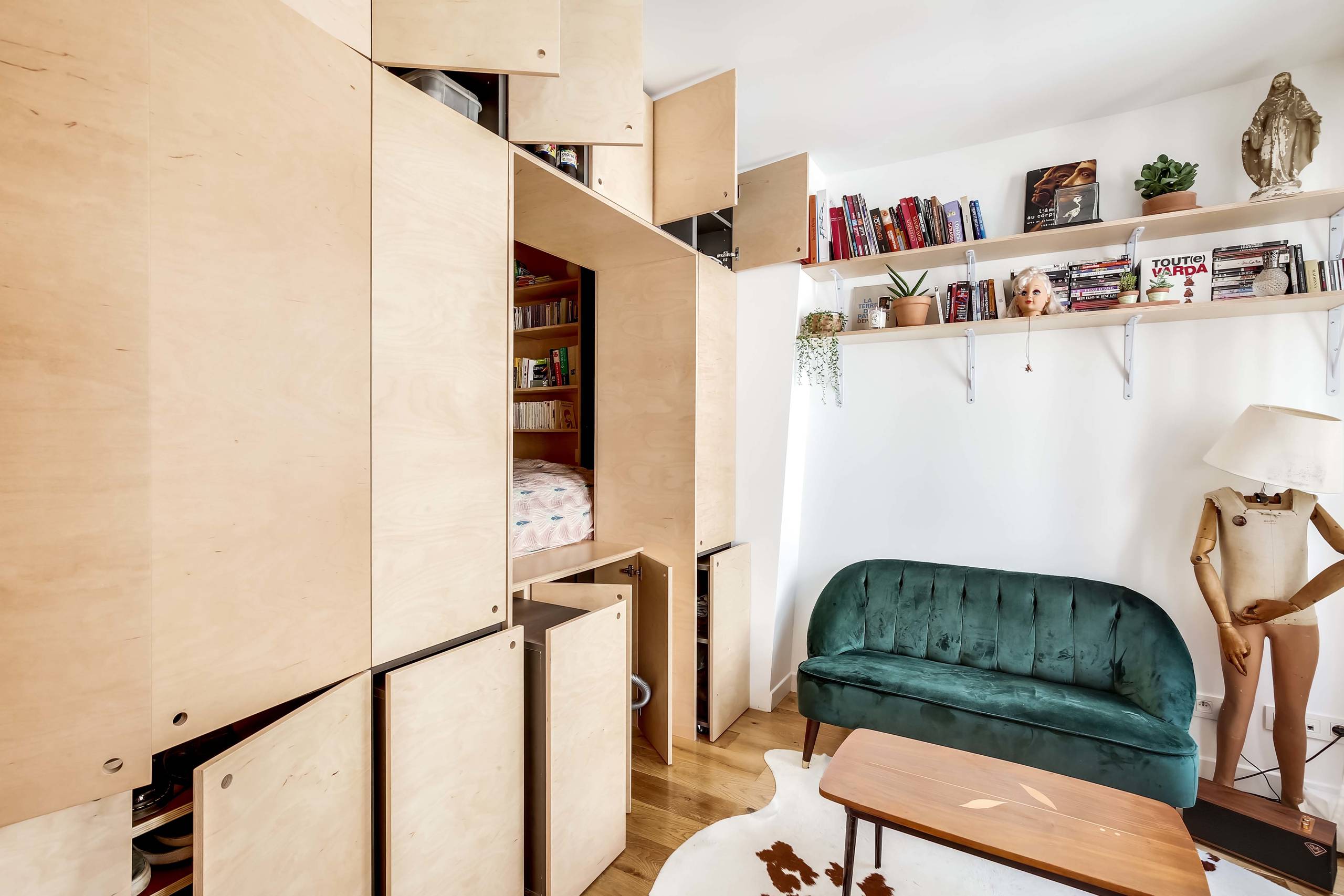 Après. Après l’aménagement du coin nuit fixe et tous ses rangements, il est resté un rectangle d’environ 2,5 x 4 m le long des deux fenêtres sur rue pour créer le salon. Le propriétaire a choisi tout son mobilier : une petite banquette en velours vert sapin, une lampe mannequin, des assises années 50 et une fausse peau de vache en guise de tapis. Avec quelques équerres apparentes et deux planches en contreplaqué de bouleau, il dispose maintenant d’une bibliothèque qui accueille ses ouvrages de cinéma.