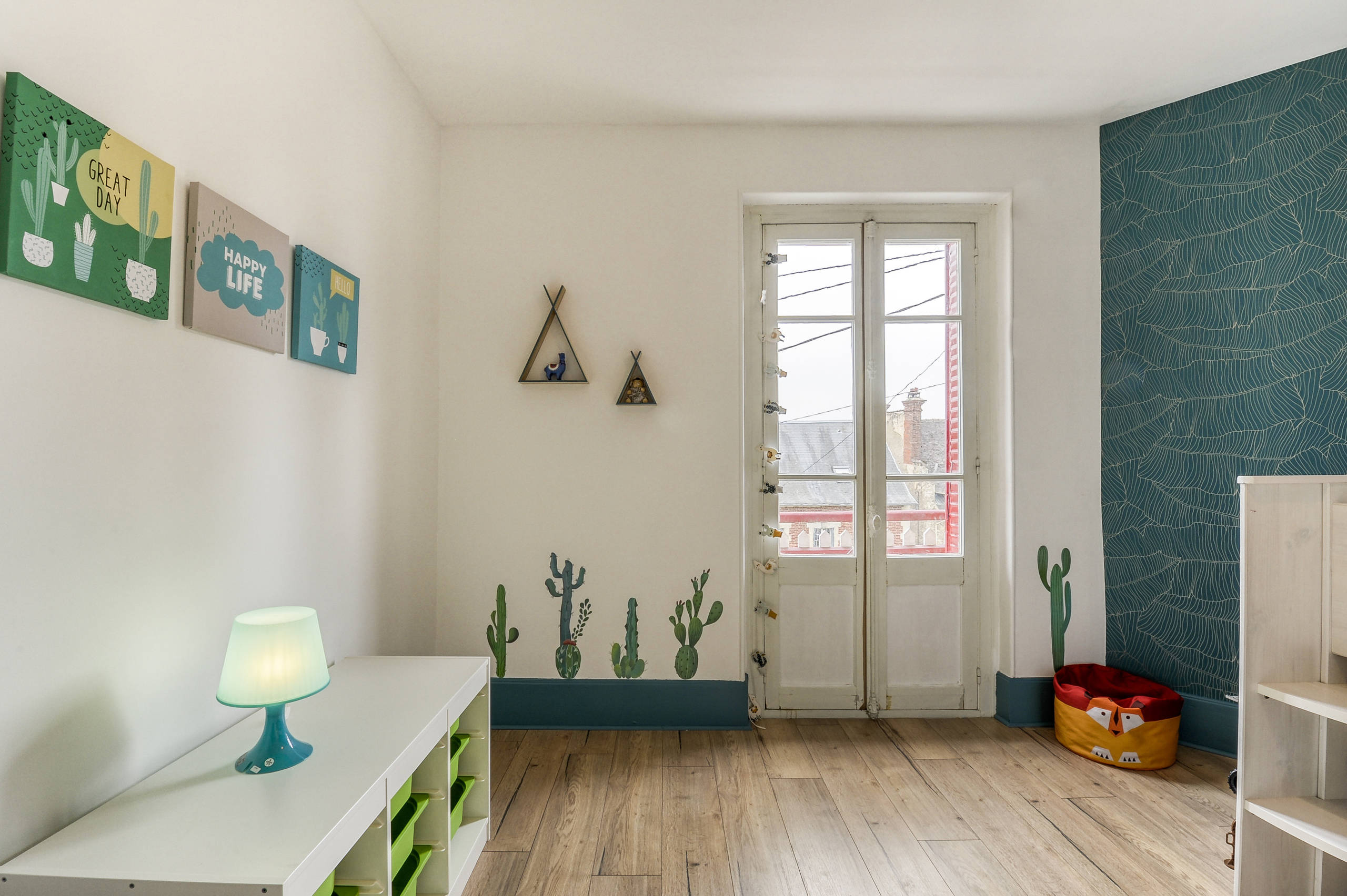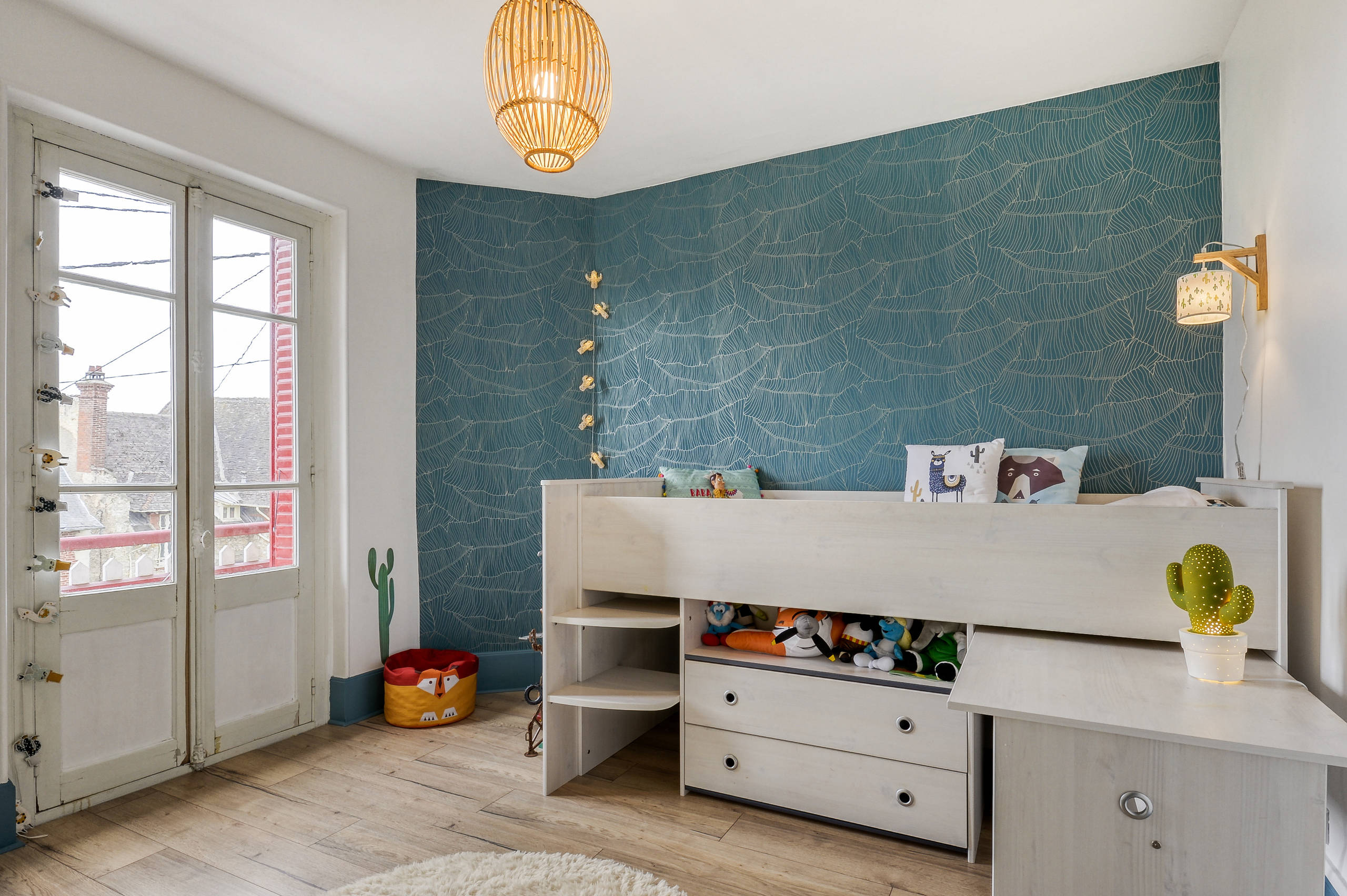 La chambre de de l’ainé âgé de six ans s’inspire des teintes et motifs d’Amérique du Sud. Le petit garçon avait envie d’une ambiance inspiré de son animal préféré, le lama. Sur les murs, des stickers en forme de cactus complètent ce décor haut en couleur.