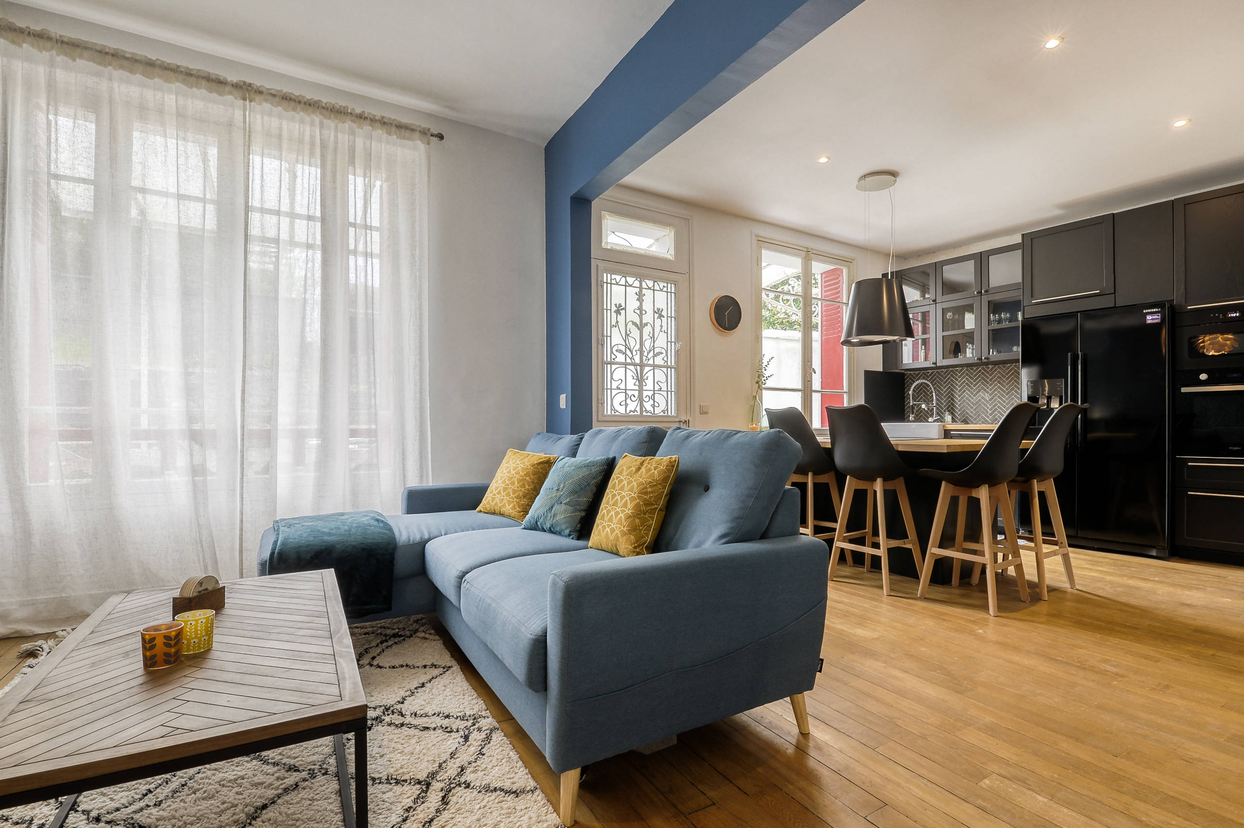 Après. Entre la cuisine et le salon, le mur était semi-porteur. La partie haute a dû être consolidée grâce à un renforcement en béton. « La peinture bleue qui encadre l’ouverture entre les deux anciennes pièces permet de créer une continuité avec l’entrée tout en délimitant les deux espaces », commente Emilie.