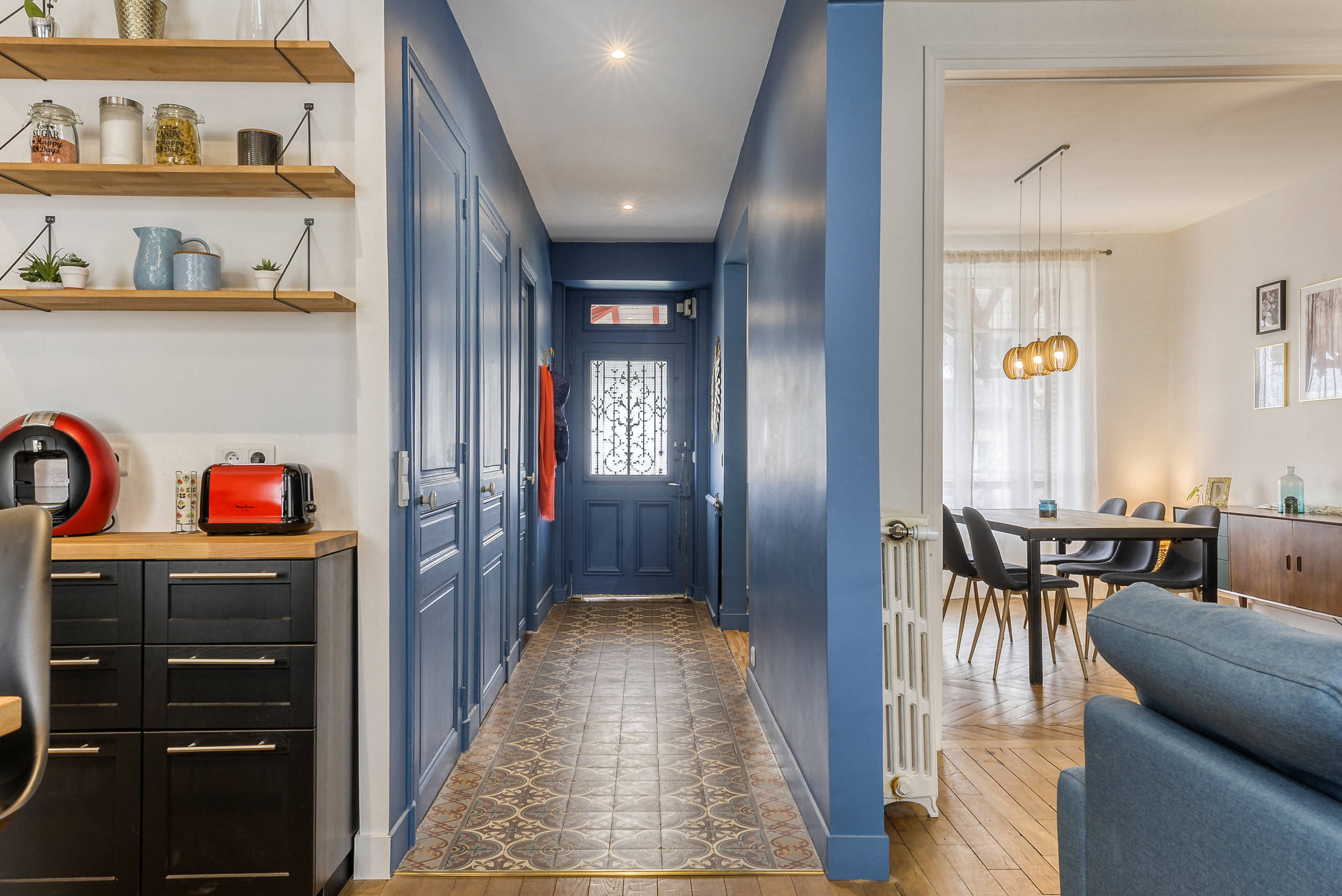Après. Les anciennes tapisseries ont été déposées et remplacées par une peinture d’un bleu vif qui dynamise l’entrée et forme un contraste avec le charme rétro du carrelage.