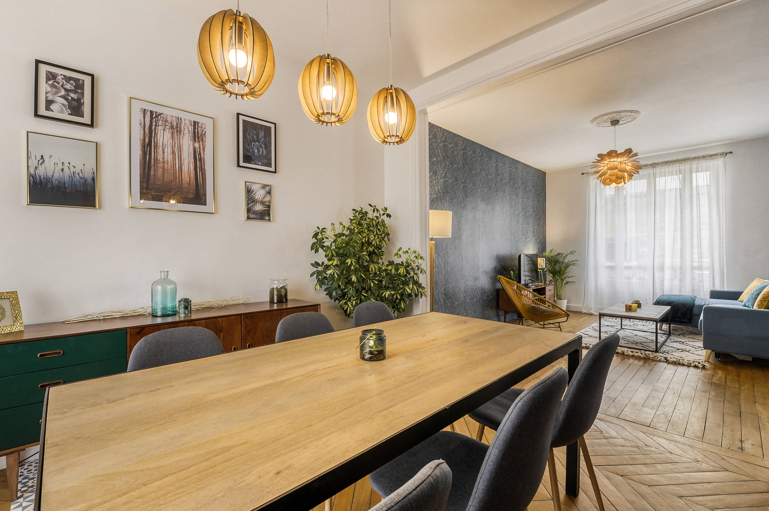 Un buffet bas aux accents scandinaves et une table en métal et manguier massif sont associés à un trio de suspensions en bois clair et aux lignes graphiques.
