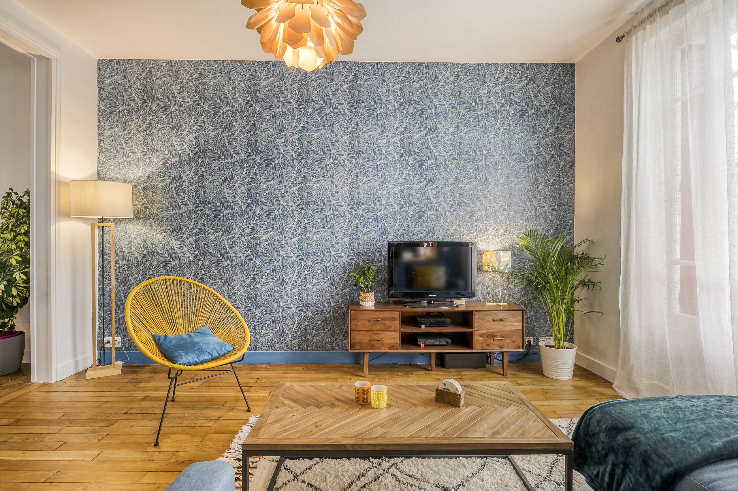 Dans le salon, un meuble TV en acacia massif s’associe à un canapé en tissu bleu et à un fauteuil Acapulco jaune moutarde qui réchauffe l’ambiance. Pour compléter ce décor chaleureux, un tapis en laine style berbère et de grands rideaux en lin blanc apportent une touche lumineuse et cosy.