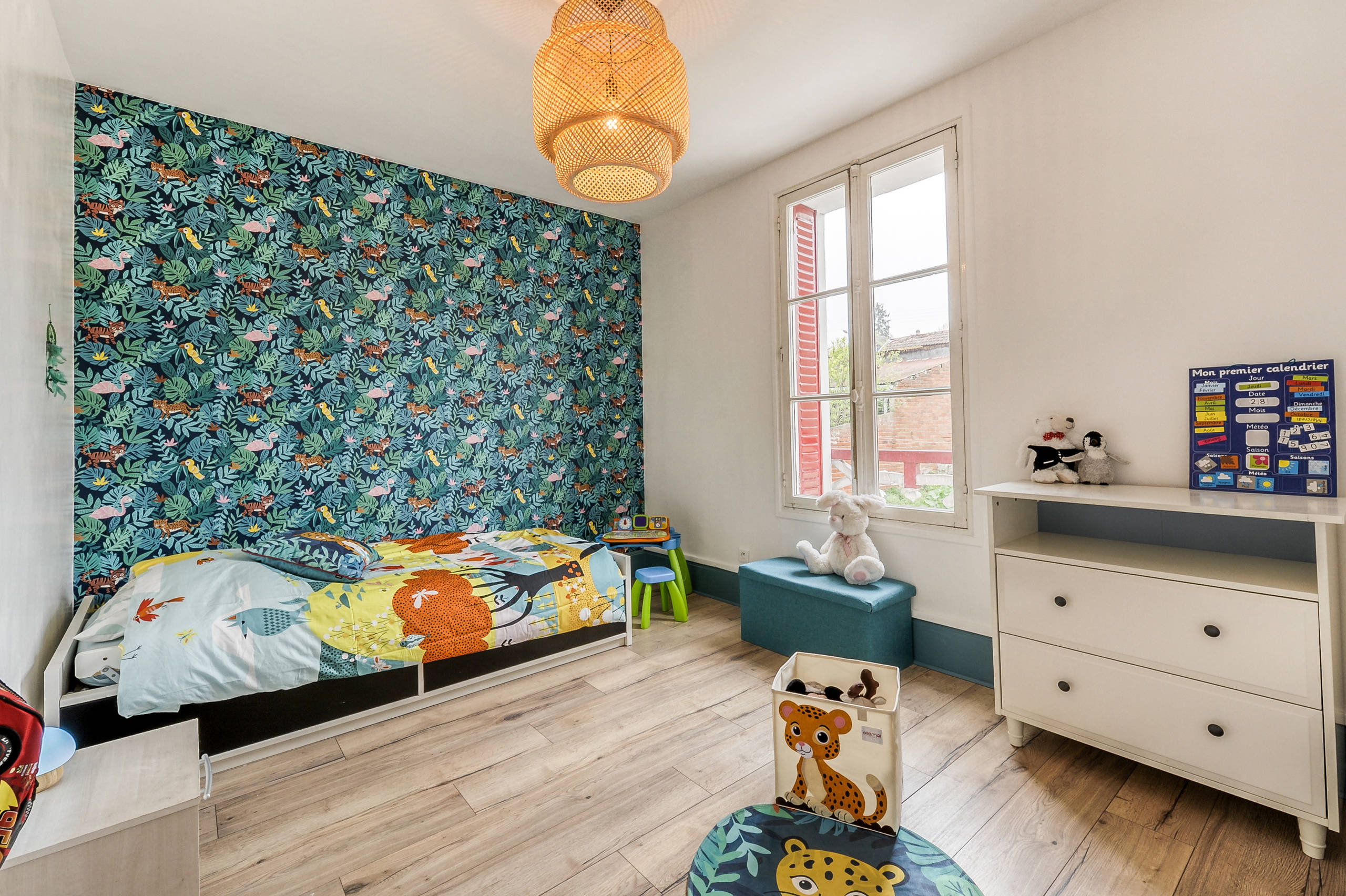 La chambre aux couleurs vitaminées du cadet s’inspire des couleurs de la Savane. On retrouve la même teinte bleue sur les plinthes. Celle-ci s’associe cette fois-ci à un papier peint au motifs tigres et flamants roses. Le tapis et le cube de rangements sont issus de la même collection que le papier peint et se marient à une grande suspension en bambou tressé.
