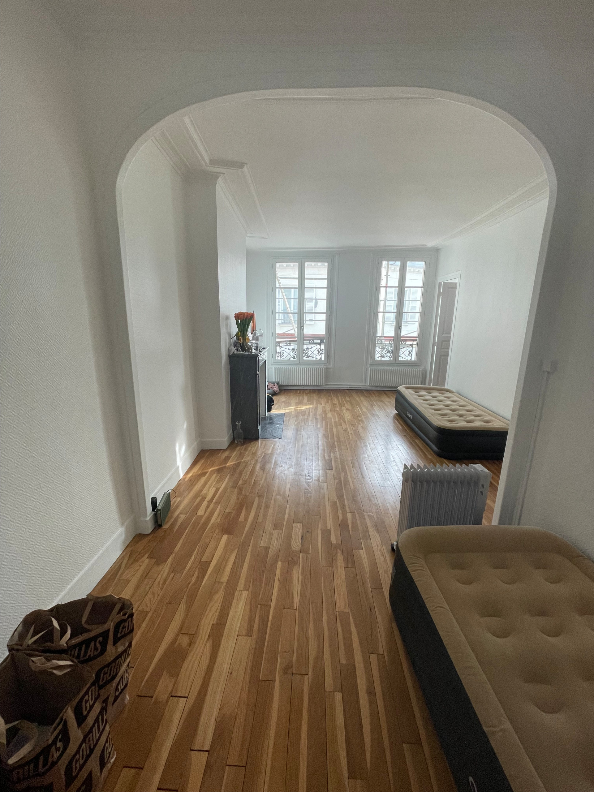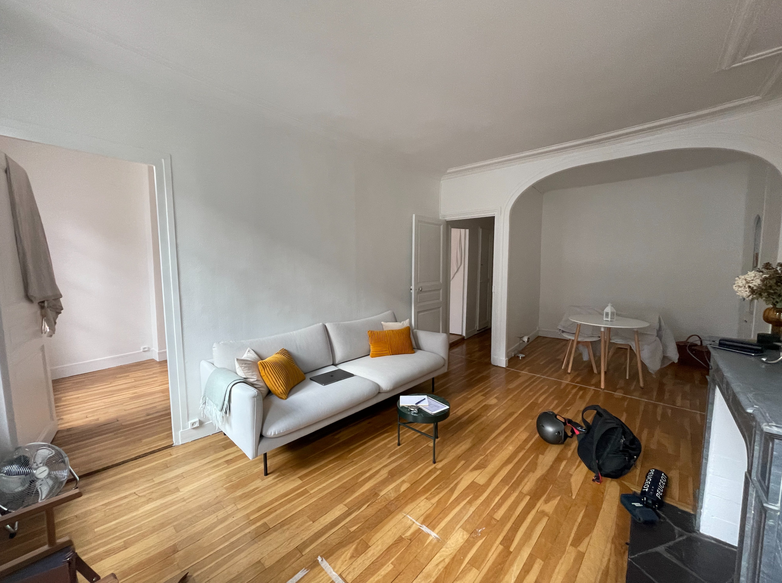 Avant. Cette photo des deux salons date de la toute première visite des professionnels Anne Chemineau et Franck Voyer de Decor Interieur. Les propriétaires s’étaient déjà installés sommairement dans l’appartement afin de profiter de leurs escapades parisiennes sans aller à l’hôtel.