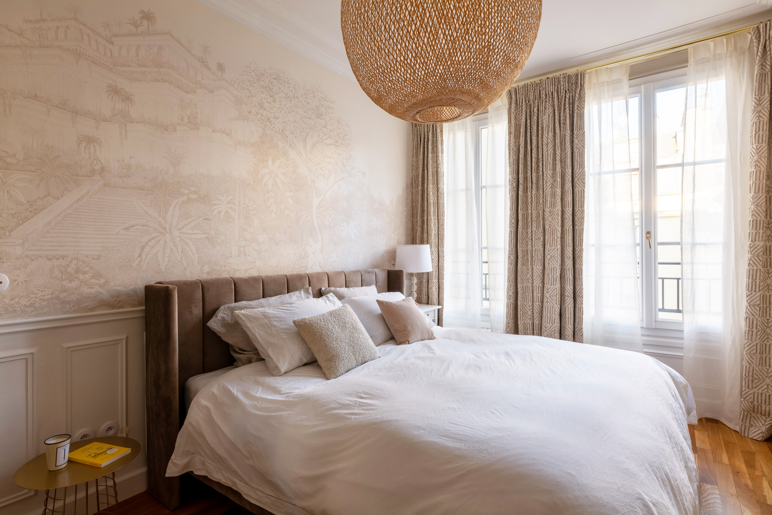 Un décor tout en douceur a été créé ici, à base de matières naturelles, de couleurs neutres et de textiles feutrés. Les murs sont rythmés par des cimaises qui occupent le tiers inférieur de leur hauteur, comme il était d’usage à la fin du XIXᵉ siècle. Au-dessus, le papier peint de style classique, Jardin suspendu doré (Les Dominotiers), confère du chic à l’ensemble tandis que les doubles rideaux en tissu Casal apportent une touche douillette et cossue.
