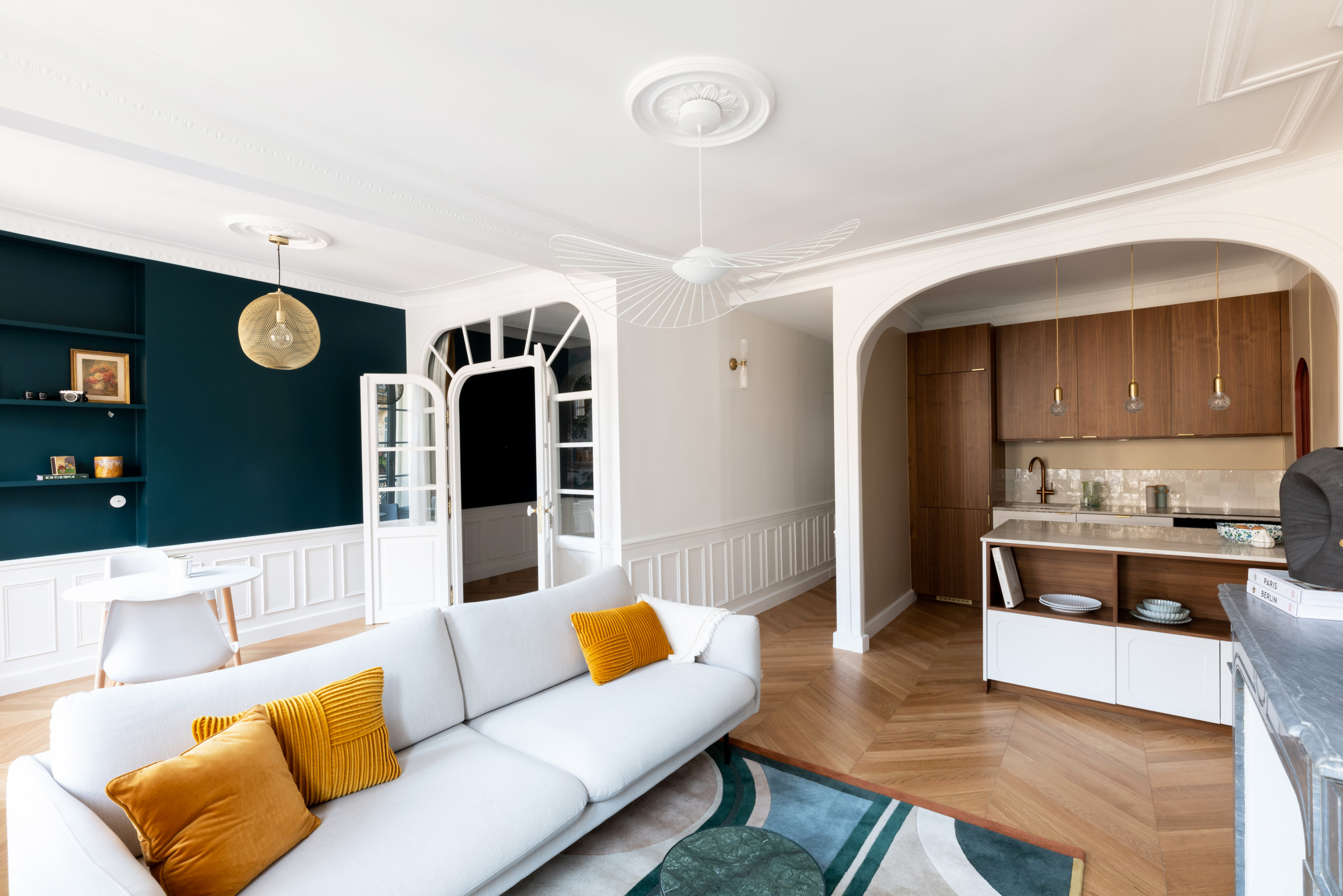 En ce qui concerne l’esthétique, les Berlinois avaient une demande claire : retrouver le charme et le chic des beaux appartements parisiens, sans faire fi de touches de couleurs fortes dans la palette des verts et bleus, leurs couleurs préférées.
