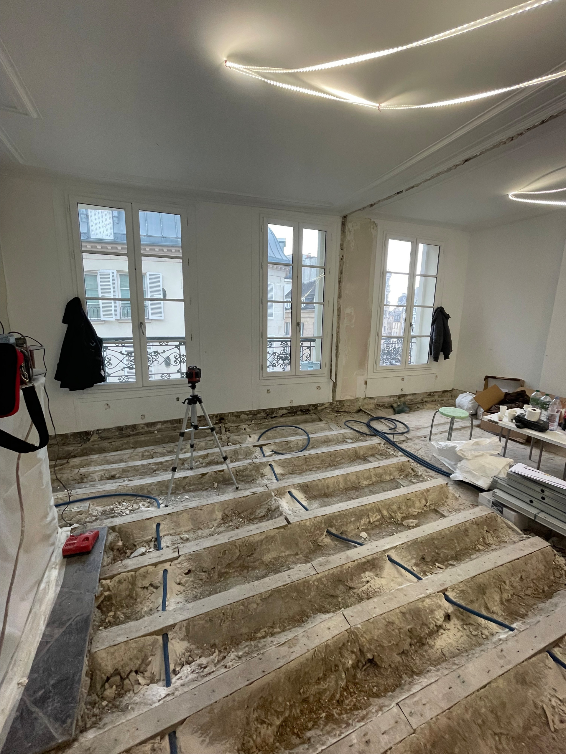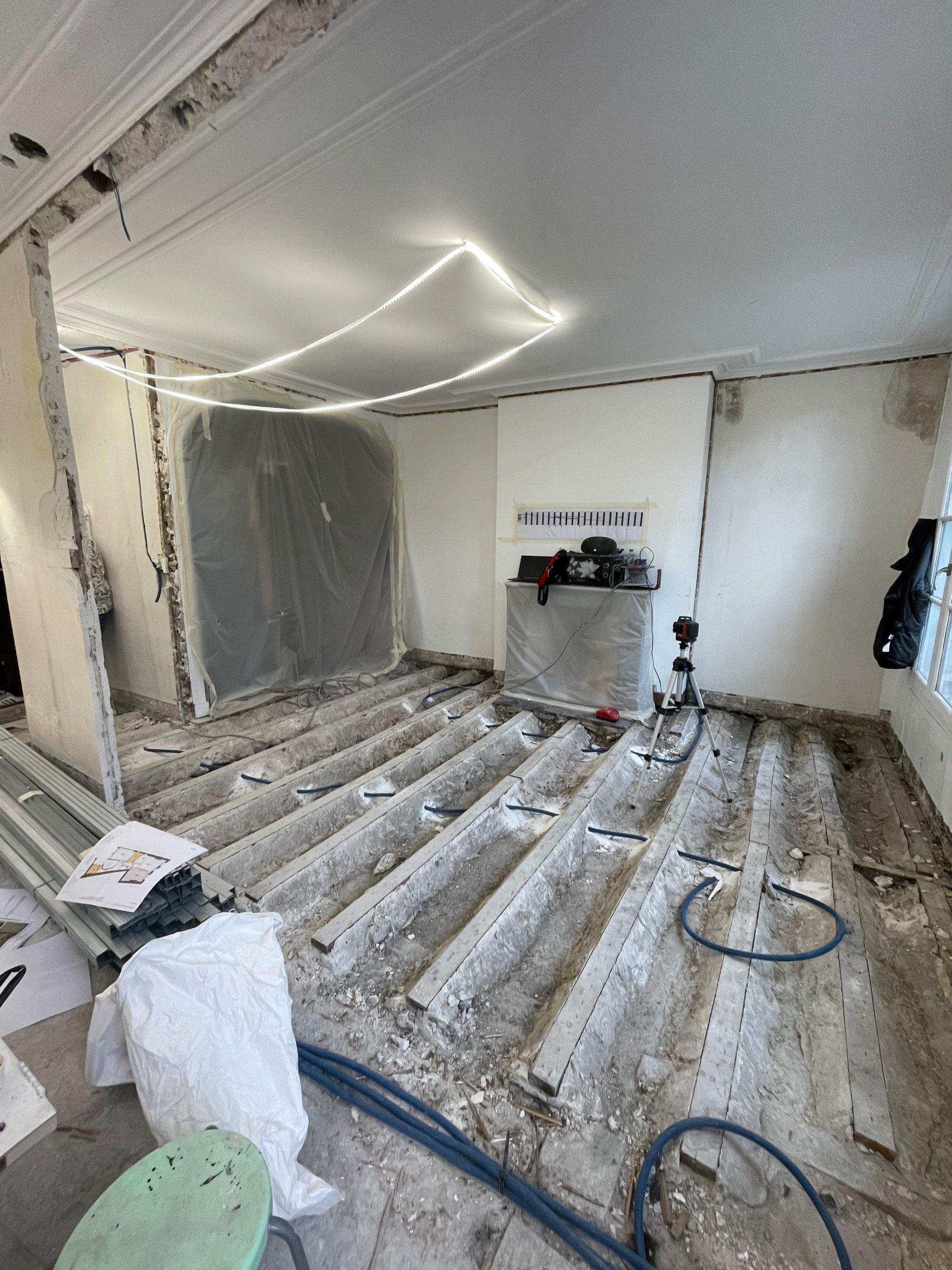 En cours de travaux. Le sol a été entièrement déposé et le parquet remplacé pour tenter d’uniformiser le niveau du séjour. Une belle surprise attendait l’équipe : « Nous craignions de trouver des tuyaux dans le sol qui auraient expliqué la marche du salon, mais rien ne justifiait ce dénivelé », confie Anne, soulagée.