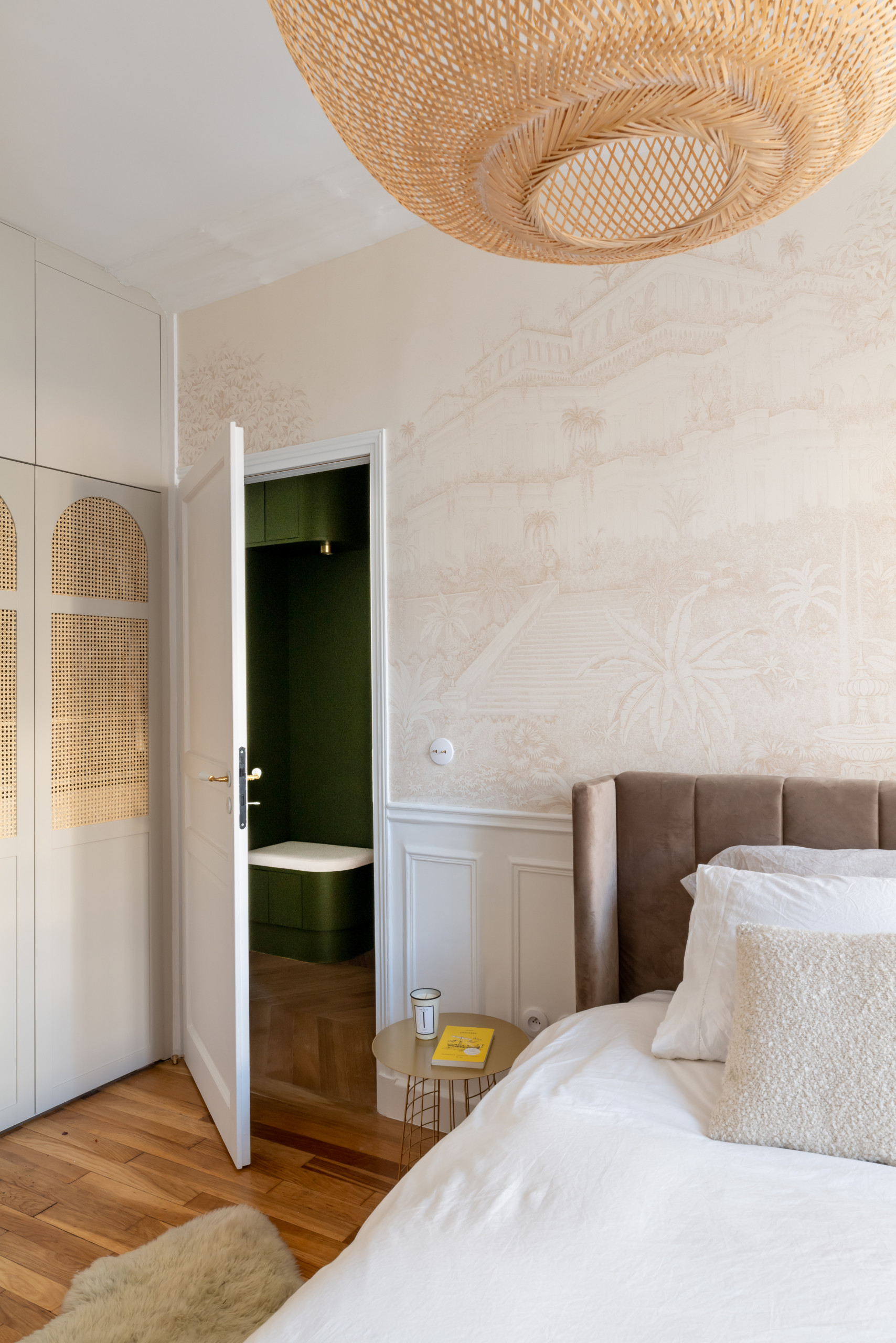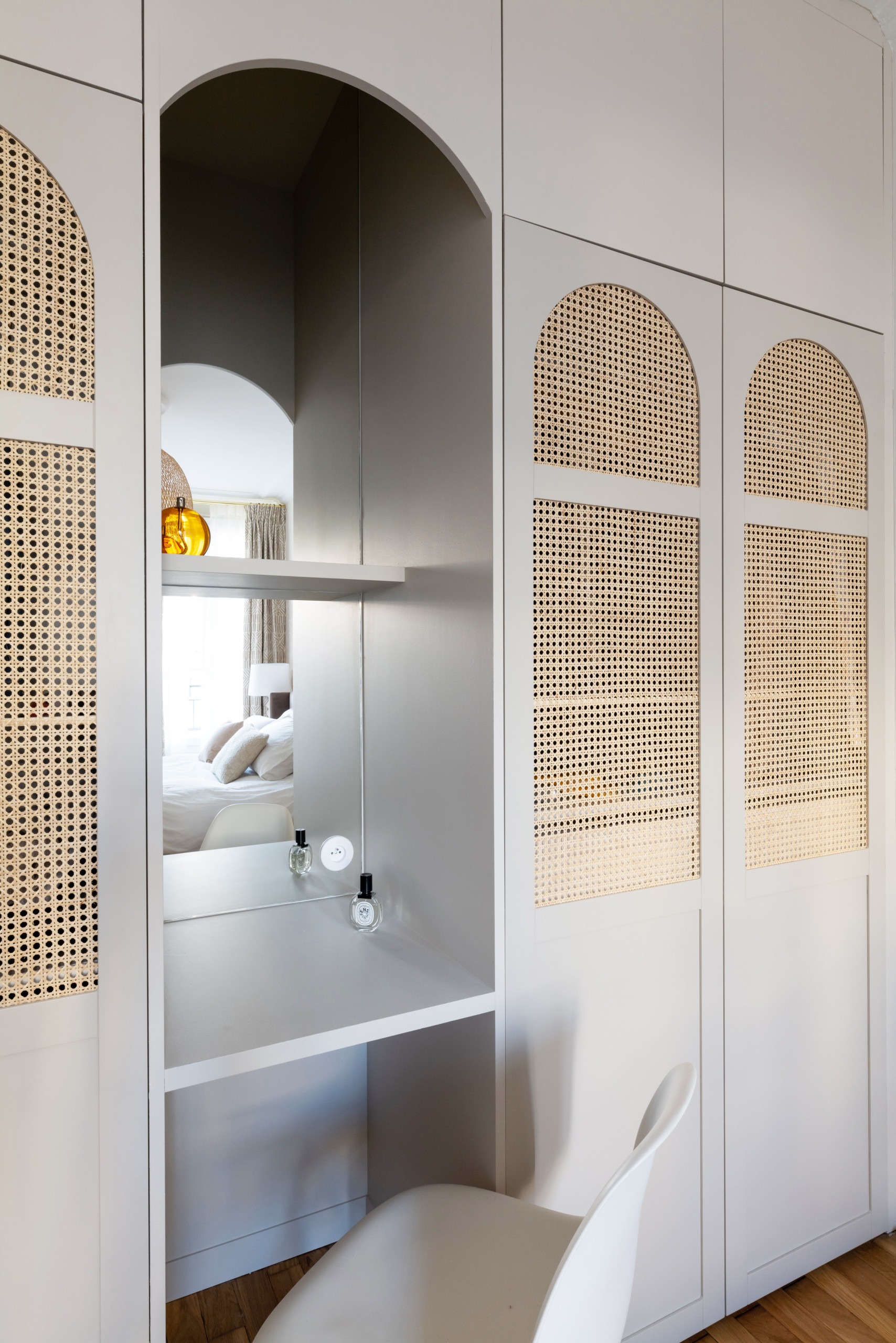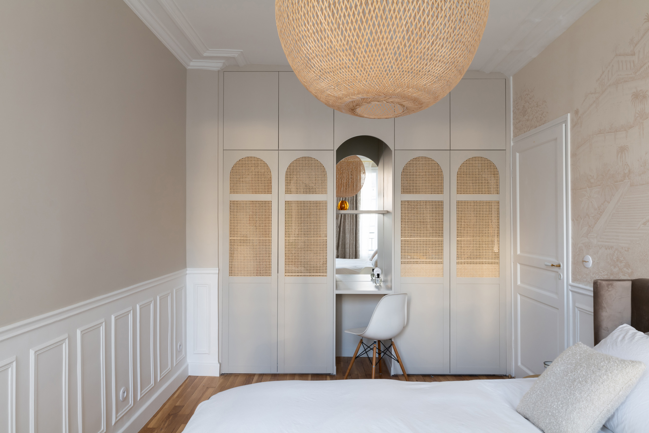 Malgré la générosité de ses dimensions, la chambre souffrait d’un manque total de rangements. Pour y remédier, un mur a été habillé de placards sur mesure. La composition, teintée en gris souris, se distingue par ses élégantes portes cintrées ornées de cannage clair.