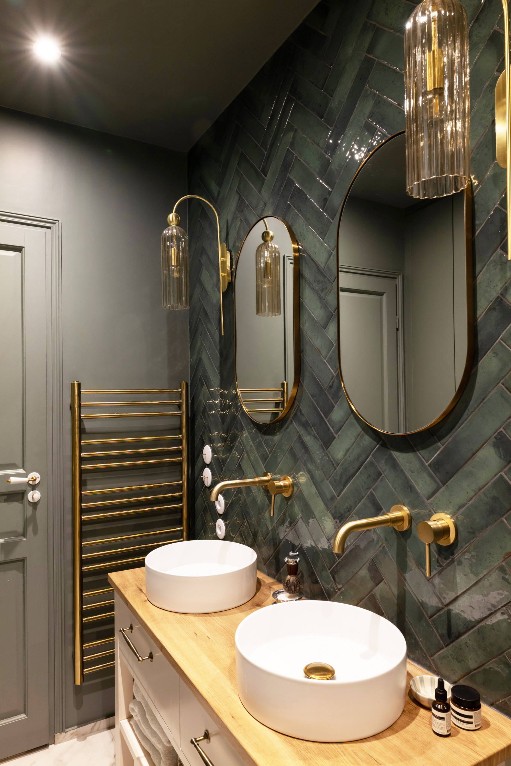 Après. La salle de bains a conservé son emplacement d’origine car, la pièce étant aveugle, il était impossible d’y installer la cuisine ou la chambre d’enfant. Pour renforcer son côté sombre, la professionnelle l’a pensée comme une élégante grotte verte et dorée, intégralement peinte, jusqu’au plafond, dans le vert Eucalyptus de chez Ressource. Le meuble vasque sur mesure, avec son plan en chêne blond, apporte du contraste et une touche chaleureuse réchauffant le zellige vert-de-gris.