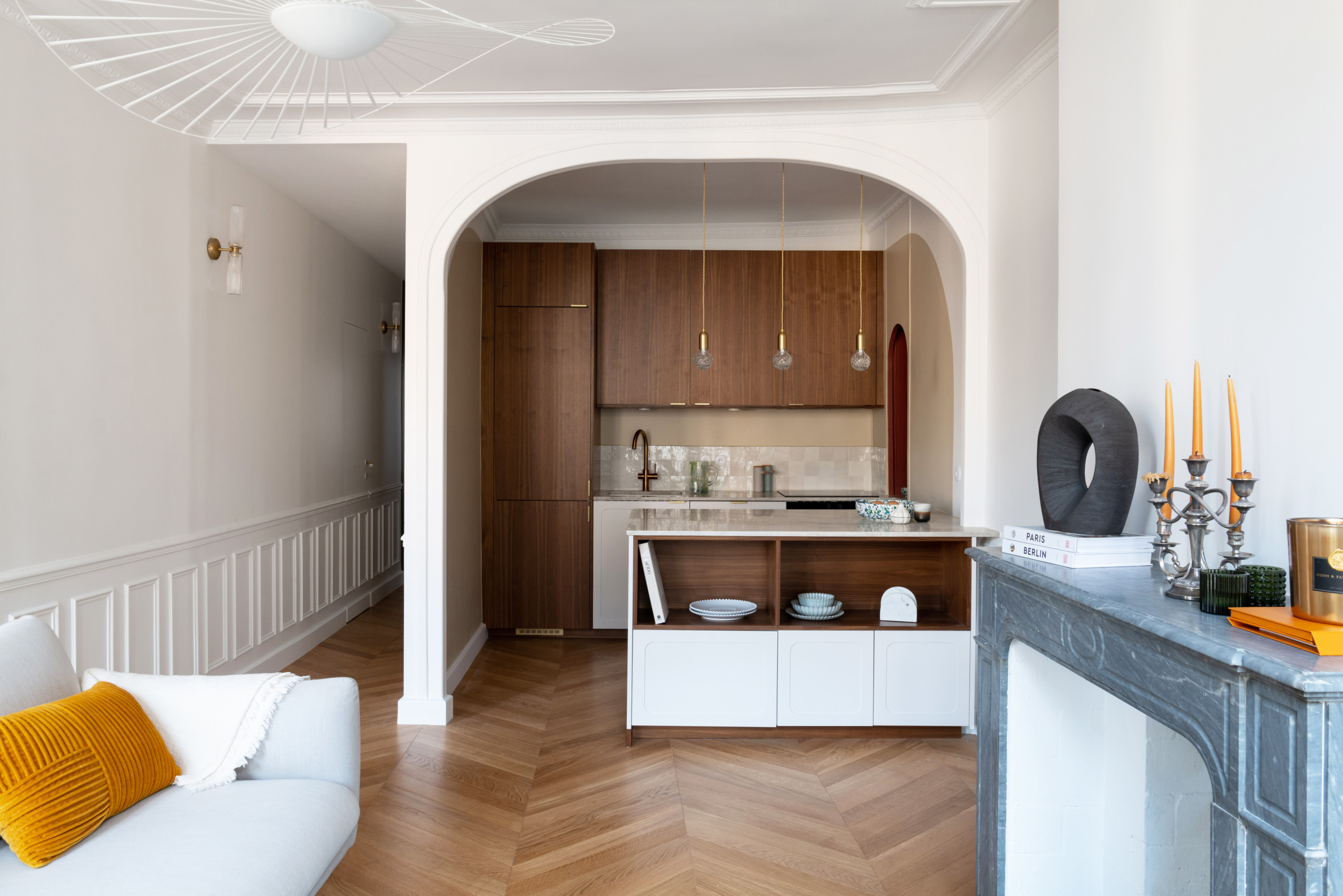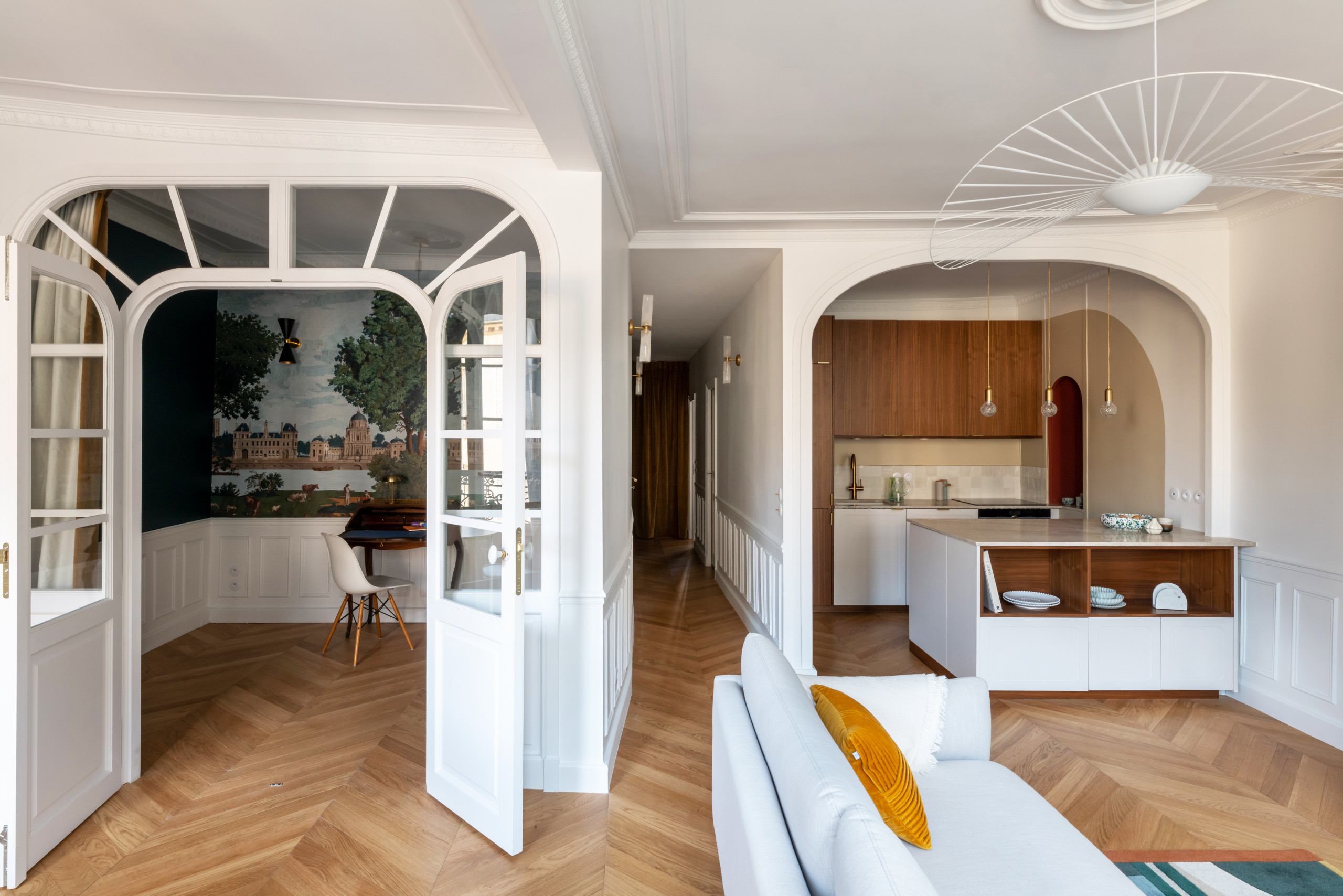 Cette rénovation intégrale dans 76 m², menée à distance pour une famille allemande, restaure le style classique parisien