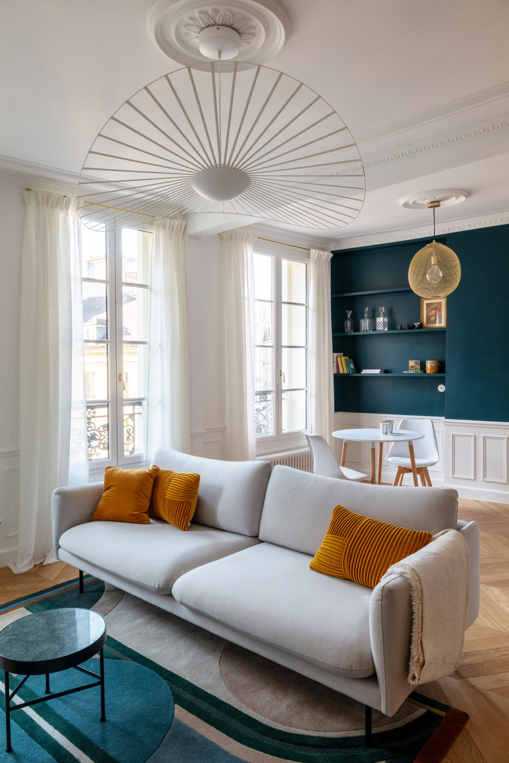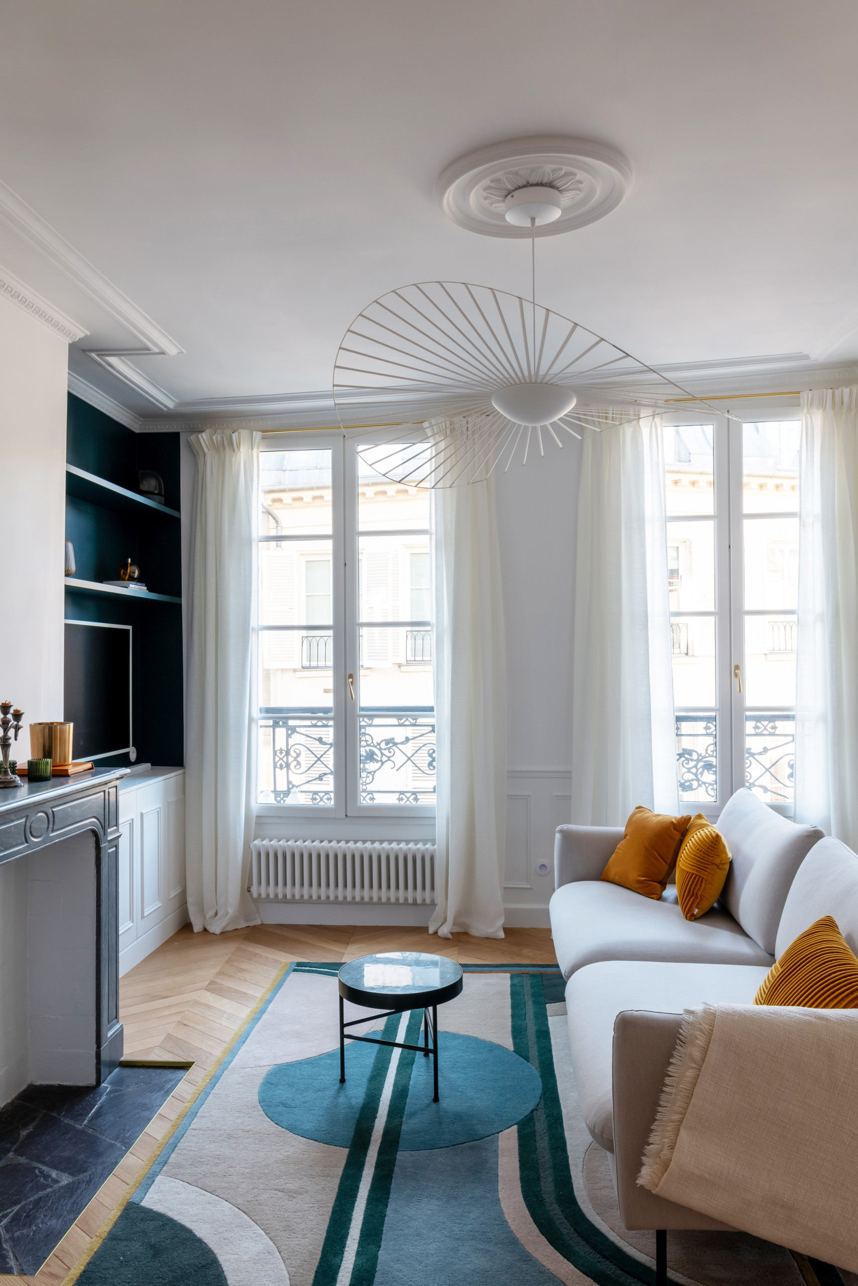D’autres beaux détails particularisent la pièce, comme la suspension Petite Friture soulignée d’une moulure au plafond ou les nouveaux radiateurs électriques imitant la fonte à l’ancienne. Dernière touche de raffinement, les voilages ont été fabriqués sur mesure avec une finition « pli simple », via le site Mesrideaux.fr, en tissu Pierre Frey Santorin, et suspendus à des tringles en laiton de chez Houlès.