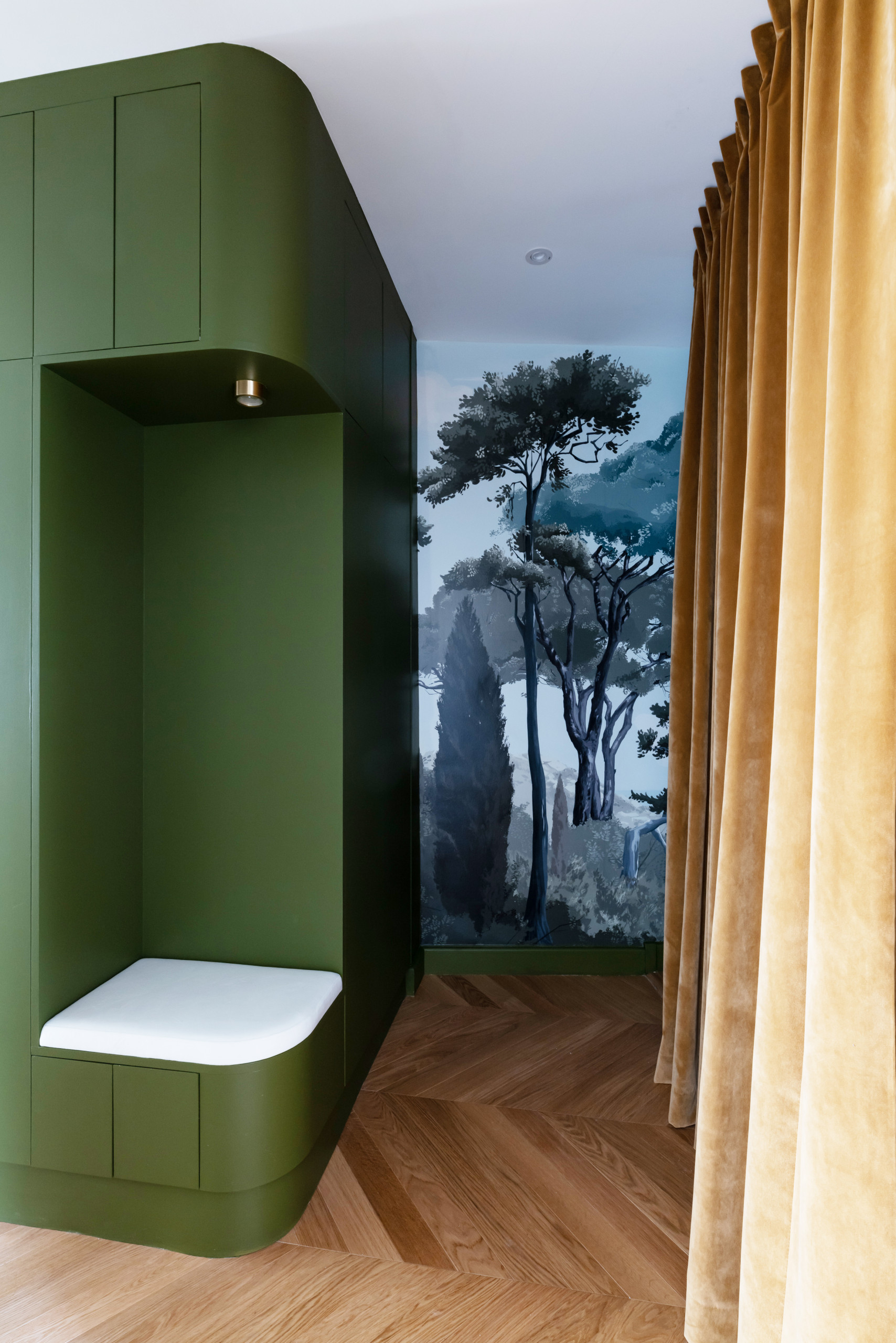 Dans le prolongement de la banquette, plusieurs colonnes assorties apportent un surplus de rangement et dissimulent deux gros climatiseurs mobiles, solution qui a été retenue pour se prémunir d’éventuelles canicules. Un vert Eucalyptus de chez Ressource habille cet ensemble menuisé tandis que le couloir, autrefois fade, a été rehaussé d’un décor arboré grâce à un panoramique de chez Papermint. « Cette métamorphose végétale crée la bulle d’oxygène citadine souhaitée par cette jeune famille », partage la professionnelle.