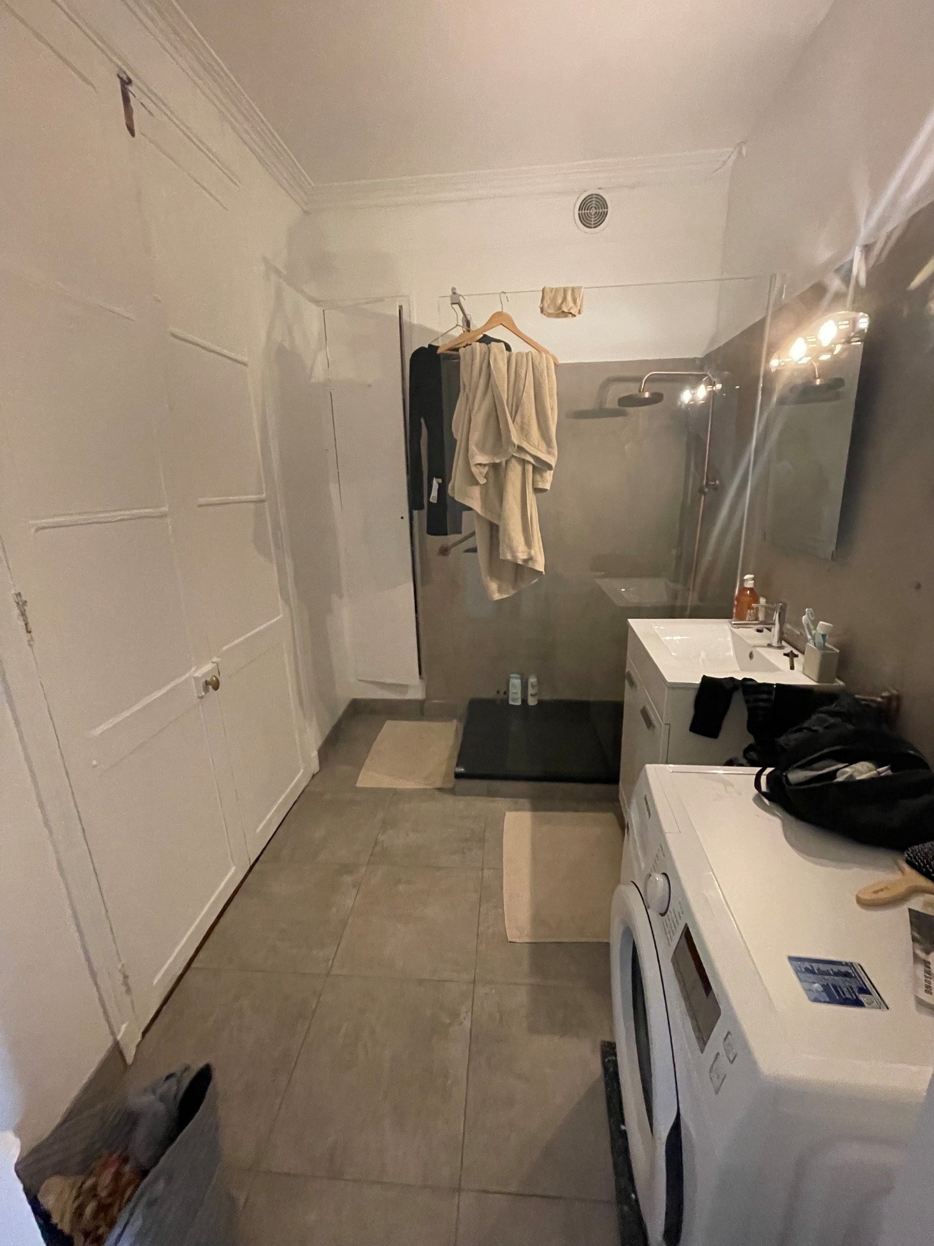 Après. Le cahier des charges des propriétaires était de bénéficier de trois espaces nuit : une chambre parentale, une chambre de bébé et un coin nuit intime pour recevoir de la famille. Pour le reste, ils étaient en attente des fondamentaux d’un appartement confortable : un vaste séjour, une cuisine conviviale, une salle de bains avec toilettes et… la climatisation, « quasiment devenue un standard pour les étrangers à Paris », souligne l’architecte d’intérieur.