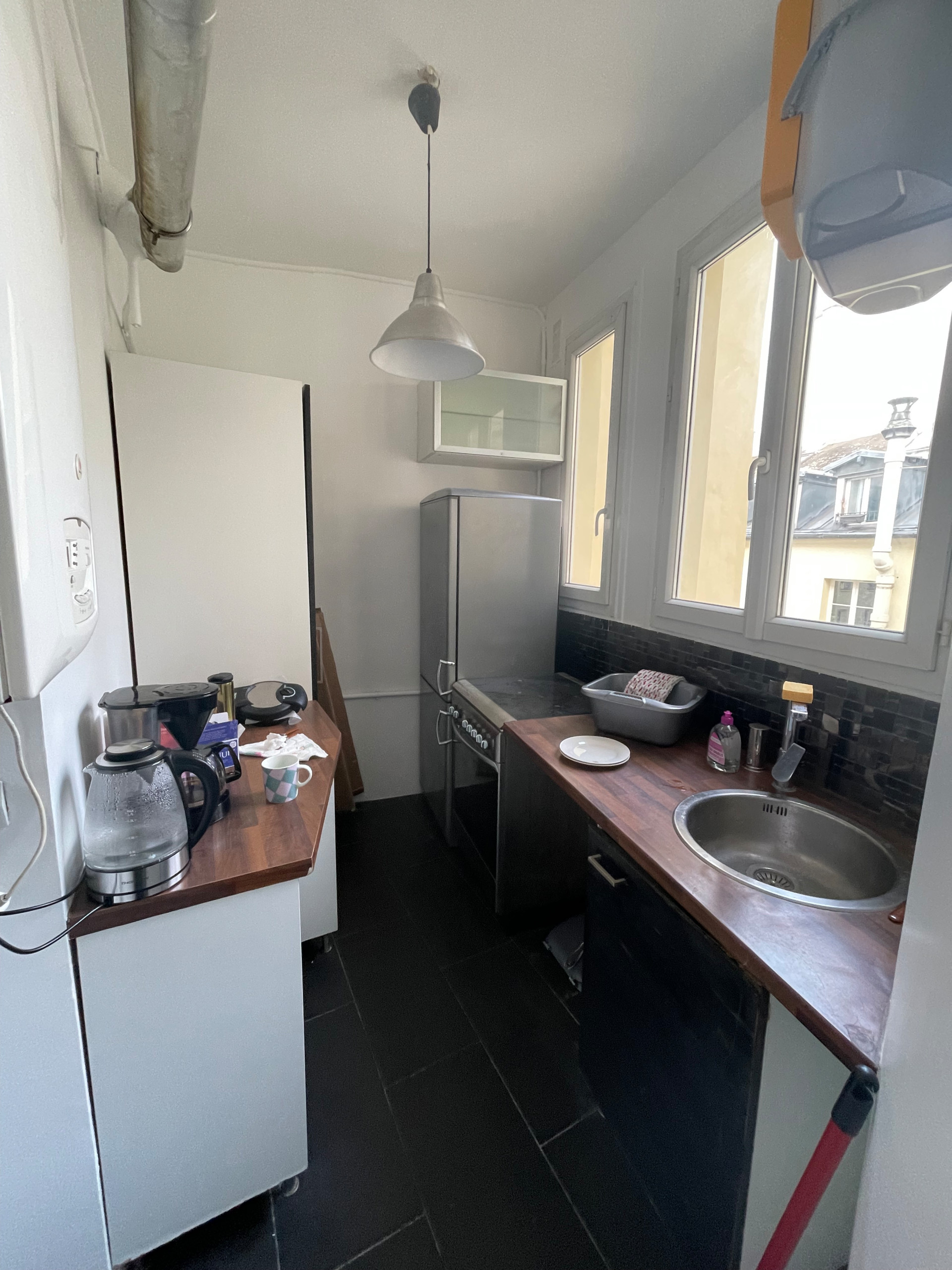 Avant. Au cœur de l’animation de Saint-Germain-des-Prés, l’appartement de 76 m² se niche au 4ᵉ étage d’un de ces étroits immeubles anciens, caractéristiques du quartier. Ce trois-pièces, qui occupe tout l’étage, présente une configuration atypique. De l’entrée partent deux couloirs distincts : à droite, une étroite circulation mène à la cuisine et aux toilettes uniques, reléguées côté cour au fond de l’appartement. À gauche, un couloir plus généreux dessert une vaste chambre sur cour, une salle d’eau aveugle, et deux salons en enfilade sur rue, dont l’un, doté d’une alcôve.