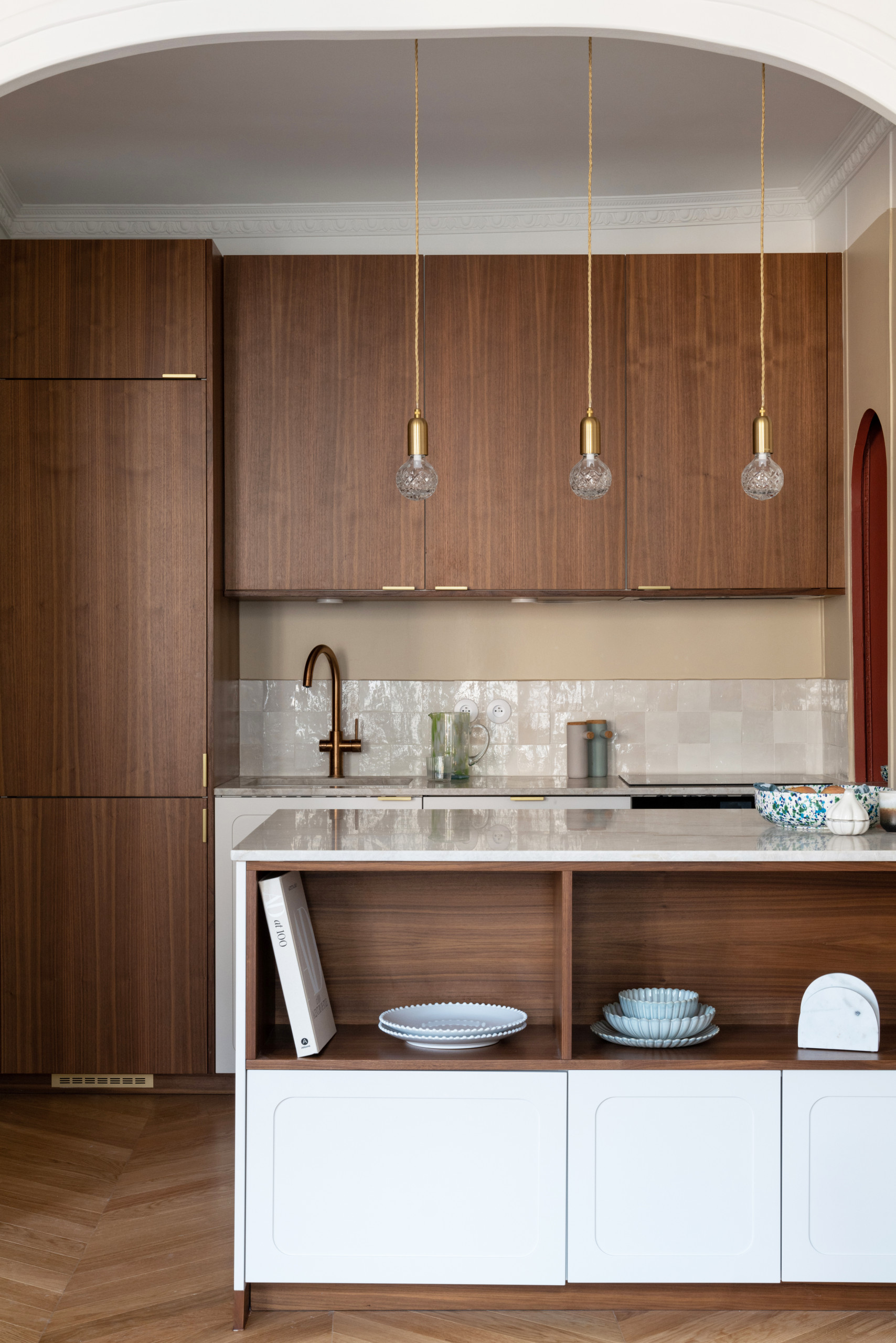 Pour le plan de travail, les propriétaires ont opté pour du quartzite Taj Mahal, une magnifique pierre naturelle originaire du Brésil qui allie la beauté du marbre à la résistance du granit. La crédence a été parée de zelliges nacrés de chez Mosaic Factory : leur surface brillante, irrégulière et émaillée, réfléchit joliment la lumière des fenêtres situées en face.