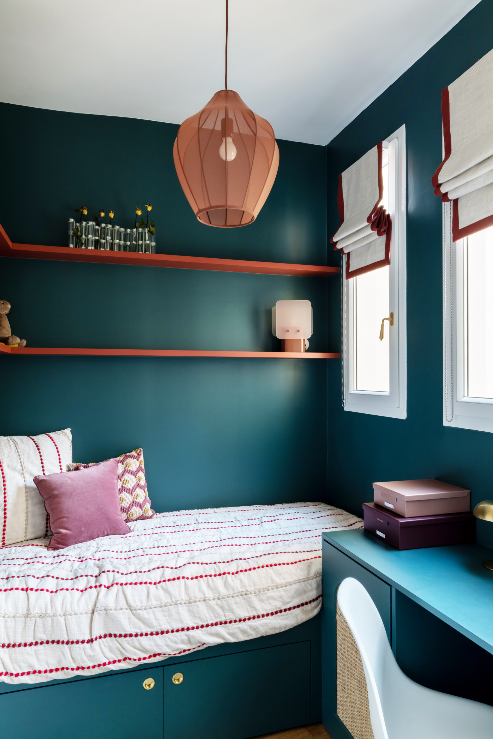Après. Cette toute petite pièce mal aménagée est devenue la chambre d’enfant, entièrement optimisée sur mesure et parée, tel un cocon, du même bleu-vert Le Belvédère de Ressource aperçu au salon. Des liserés rouge sang soulignent la tranche des étagères murales, repris par les ganses des stores bateau fabriqués sur mesure en tissu Pierre Frey.