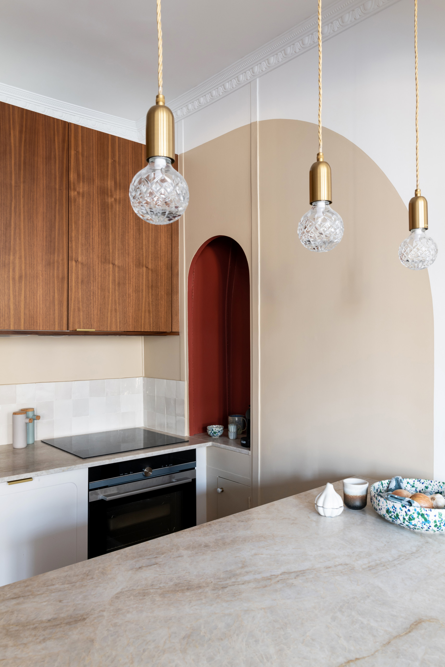 Pour sublimer une niche arrondie existante, Anne a choisi de l’habiller d’une des teintes secondaires du papier peint Grand Siècle : un rouge grenat Picture Gallery Red de Farrow & Ball. Un demi-cercle peint en beige rosé la met en valeur, tandis que des détails laitonnés apportent une touche précieuse à l’ensemble.