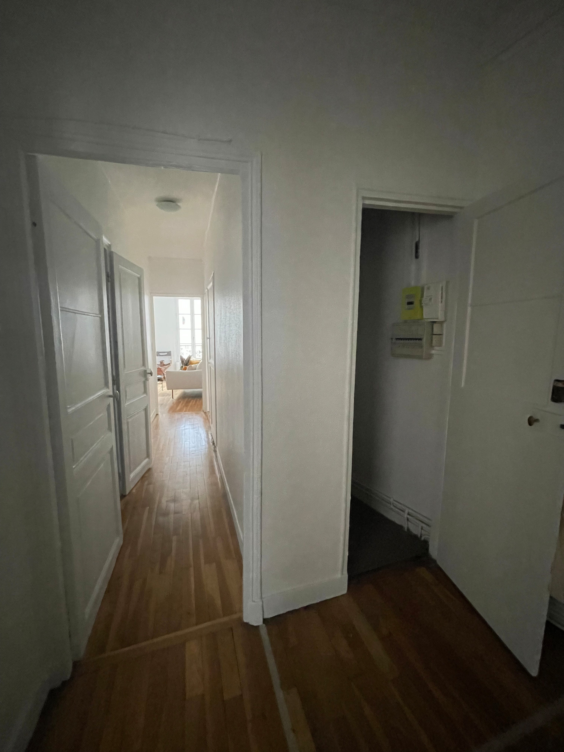 Avant. Le salon principal avant transformation. C’est vrai que l’on recommande traditionnellement de poser les lames de parquet dans le sens de la lumière. Mais ici, dans une pièce déjà très allongée, les lames fines accentuaient ce désagréable effet couloir. Or, les couloirs étaient déjà très présents.