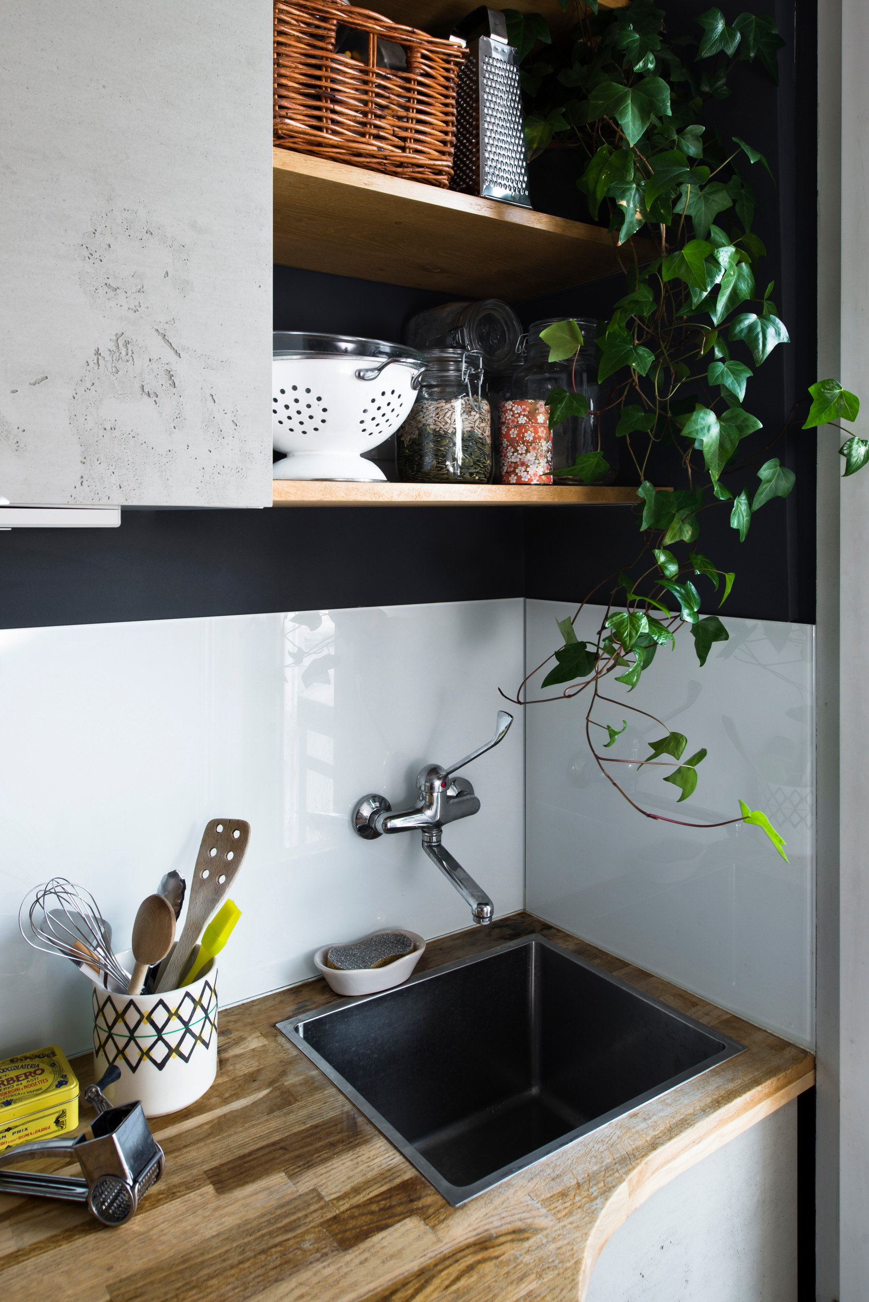 APRÈS : Laurence, fan du style industriel des lofts, a craqué sur ce modèle de cuisine aux façades imitant le béton brut. Pour garder le fil conducteur pictural, un plan en chêne lamellé-collé a été retenu. Le plan de travail, élargi à 60 centimètres, a permis d’intégrer une plaque à induction classique, sous laquelle se niche à présent la machine à laver.