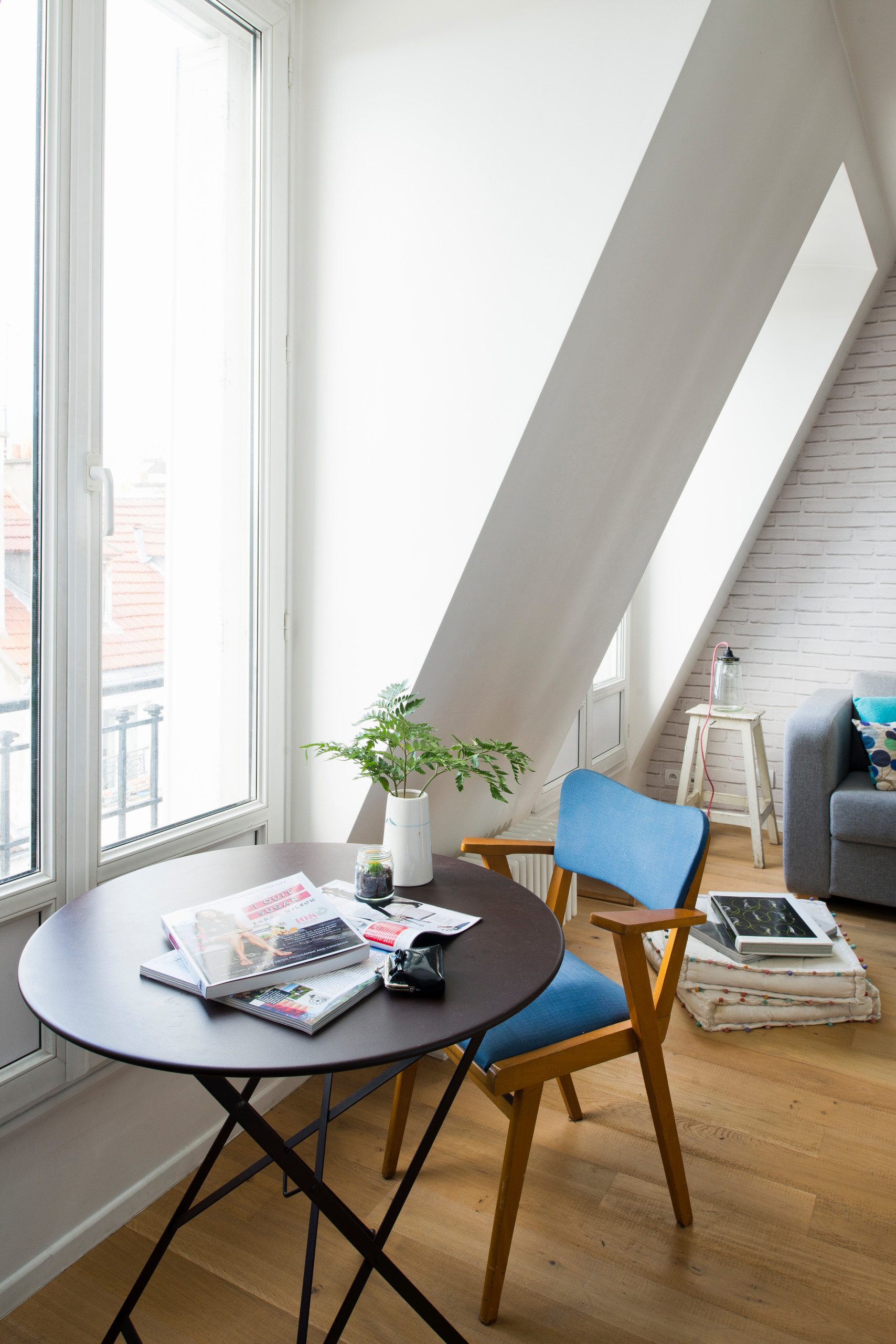 L’actrice et réalisatrice Laurence Vaissière a acheté son deux-pièces en 2008. Fruit de la réunion de deux chambres de bonnes, cet appartement de 38 m², au sixième étage d’un immeuble du XIXᵉ siècle, a su la séduire par ses charmants volumes en sous-pente, sa lumière et sa vue magnifique sur les toits de Paris. Cependant, au fil de ses modifications successives, le logement a perdu son unité et manque de fonctionnalité : les circulations ne sont pas naturelles, la cuisine et les sanitaires ont vieilli, les espaces de rangement font défaut. Quant à l’isolation, le chauffage, la plomberie et l’électricité, rien n’est aux normes.