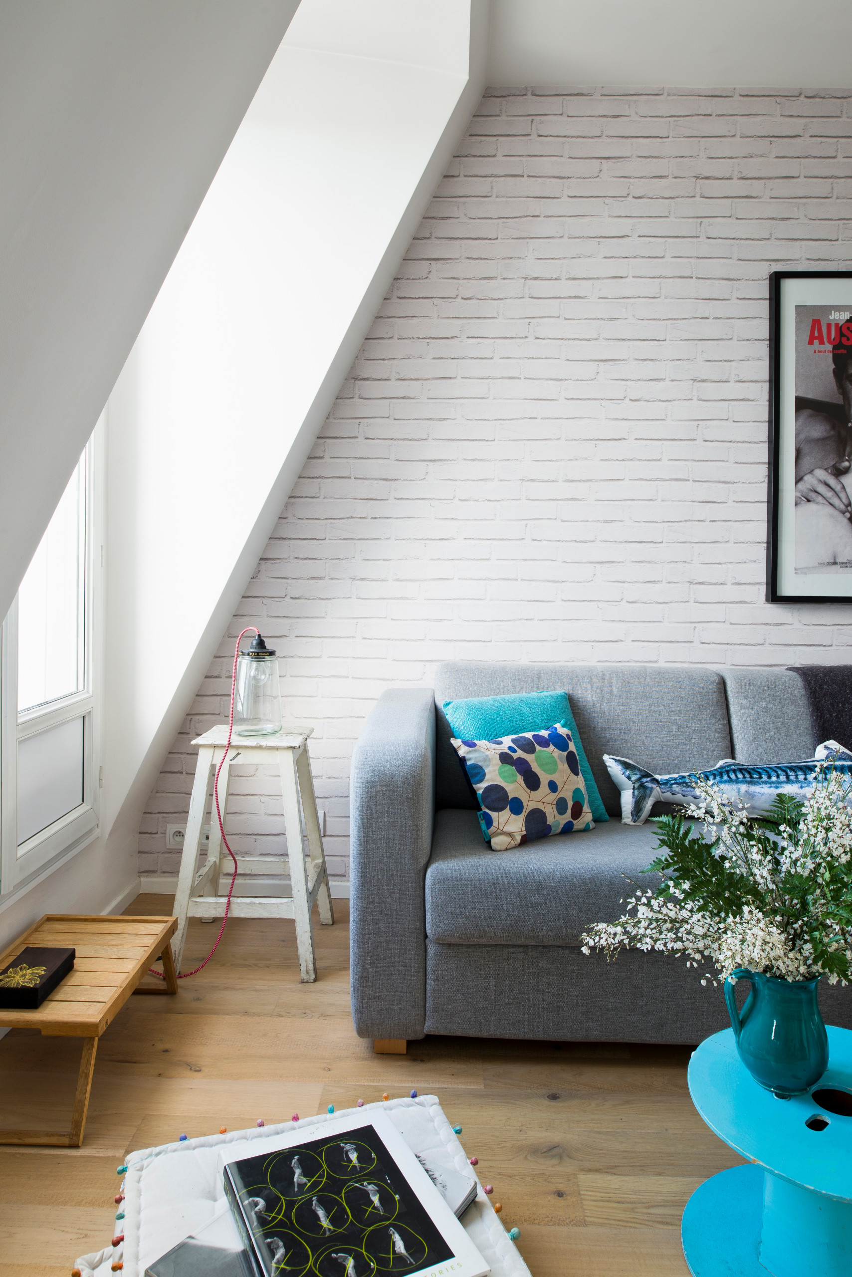 La jeune femme souhaitait se sentir dépaysée et comme en vacances en rentrant chez elle. Un papier peint imitant les briques peintes en blanc, une bobine de chantier bleu vif ou une lampe en forme de baladeuse évoquent l’esprit industriel des lofts new-yorkais.