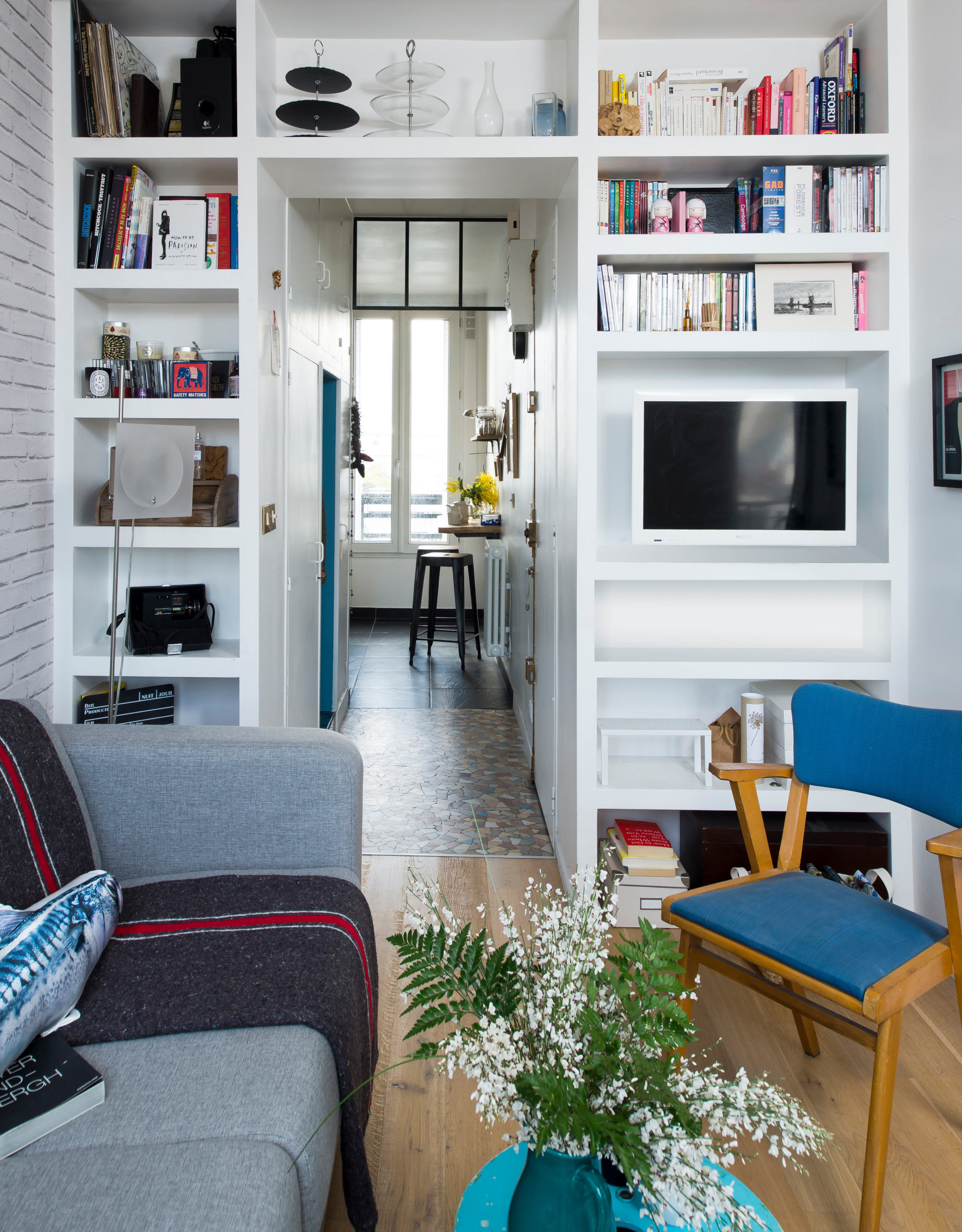 Côté pièce de vie, un parquet miel, en chêne massif, est venu recouvrir les deux sols différents, stigmates de la réunion des chambres de bonnes. L’encadrement de la porte a été particulièrement étudié pour devenir fonctionnel : habillé d’étagères, il accueille les livres, la déco et la télévision de la propriétaire. La structure sur mesure a été réalisée en cloison alvéolaire par Laurent Halgand.