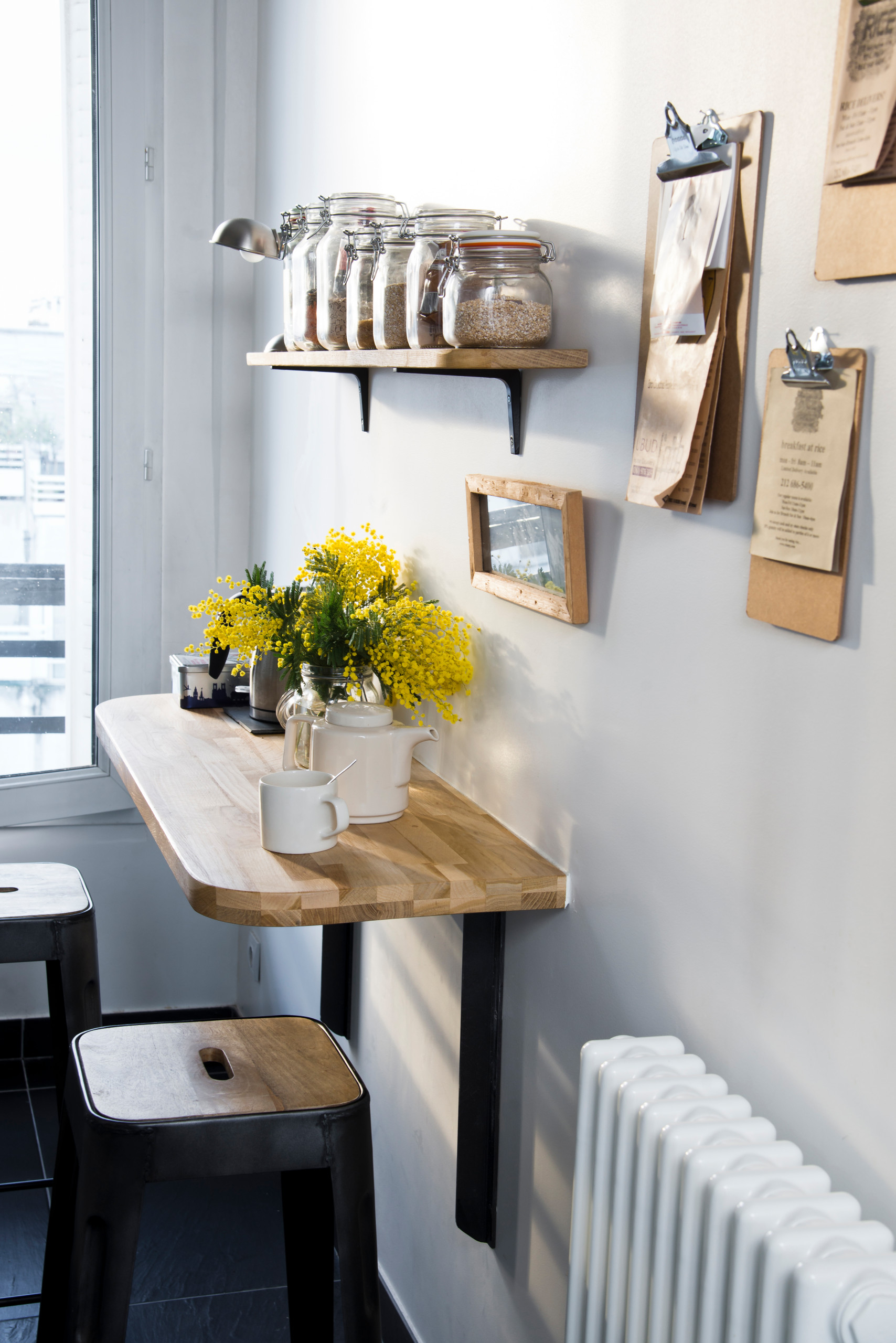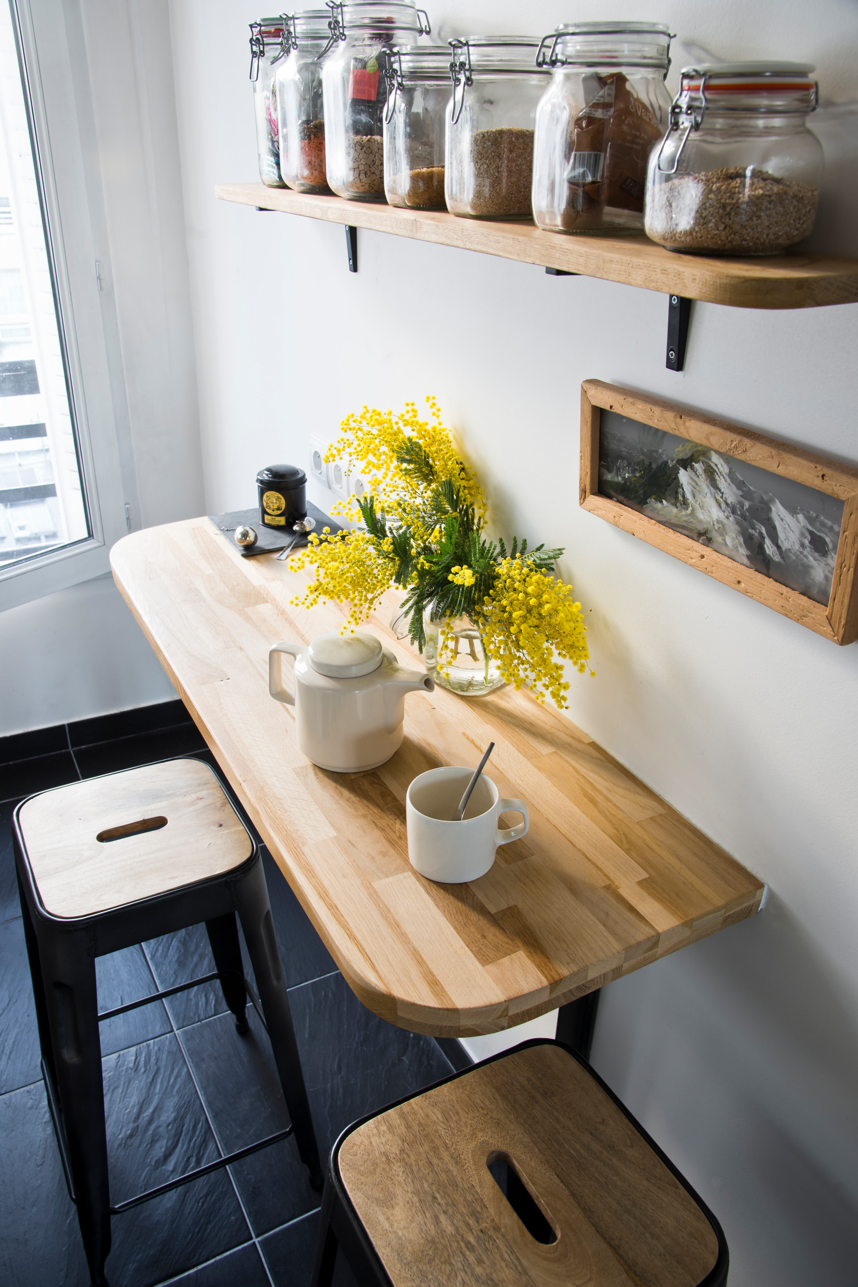 Le côté droit de la cuisine, désormais dégagé, accueille une tablette réalisée sur mesure qui permet de doubler la surface du plan de travail. Laurence peut également y déjeuner.
