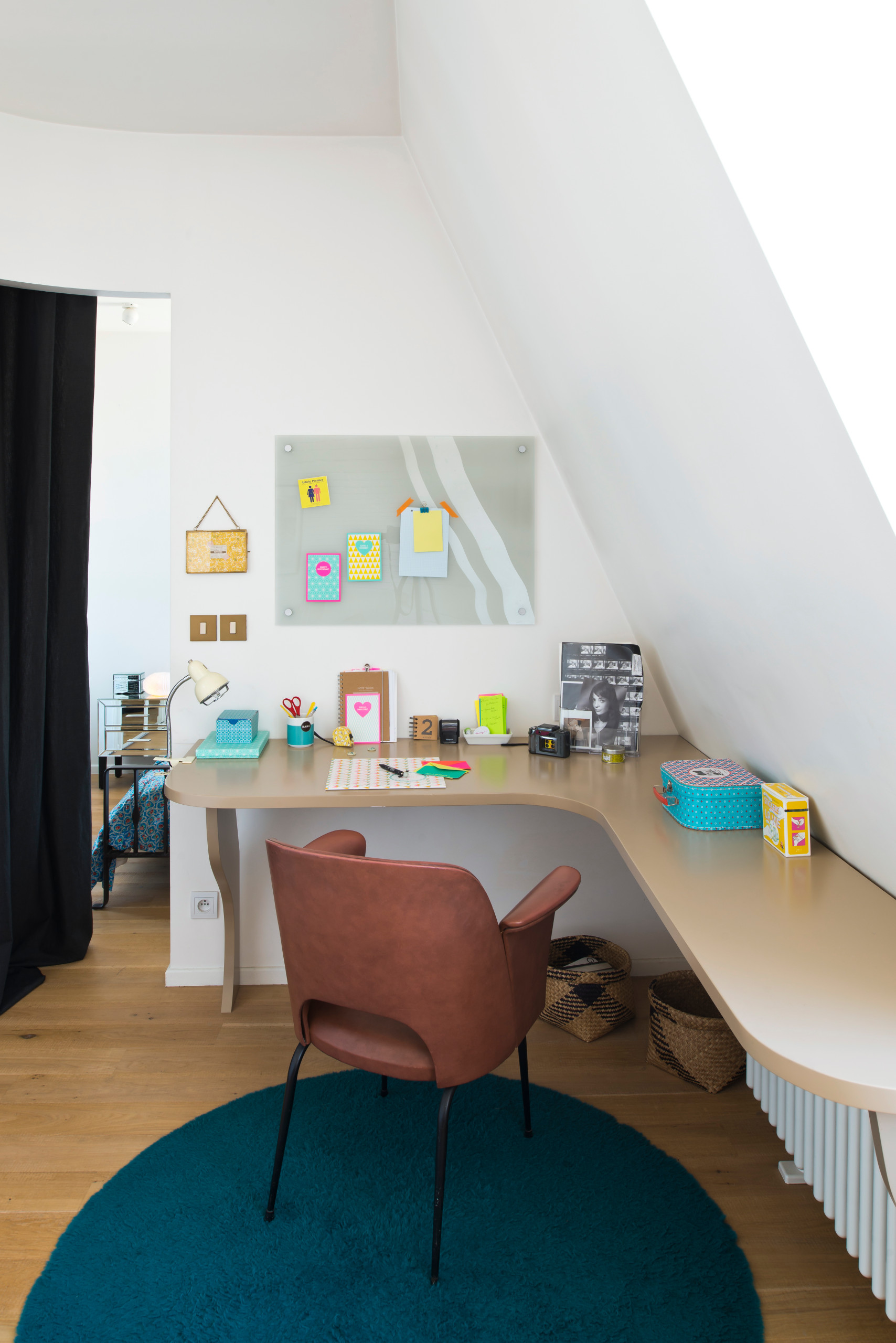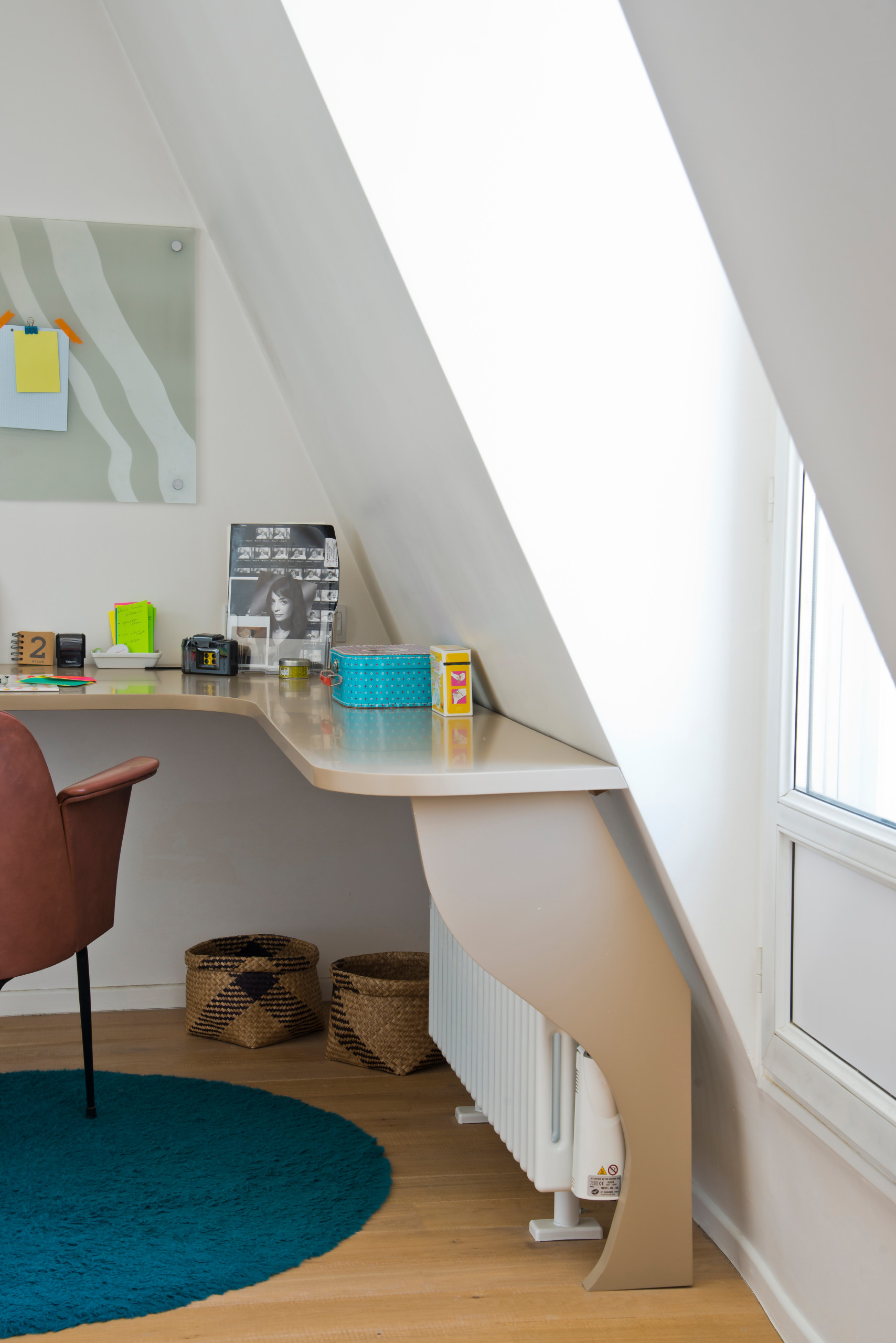 APRÈS : Olivier a dessiné un grand bureau d’angle aux formes organiques en medium laqué. « Afin de gagner de l’espace, nous avons décidé d’aménager au maximum sur mesure. Ici, afin de suivre la pente du toit, je me suis inspiré des pattes d’autruche pour dessiner les pieds », explique-t-il.