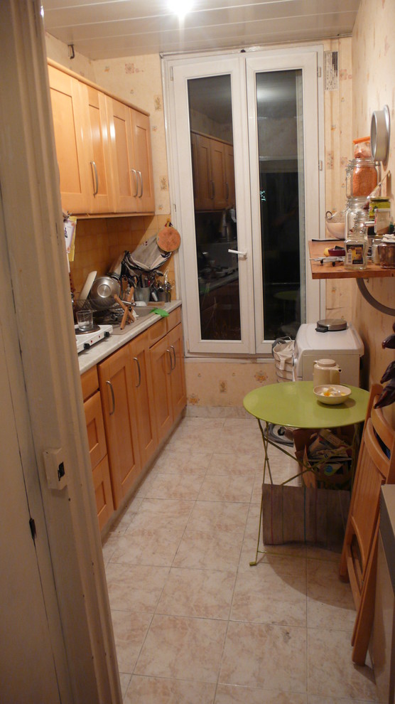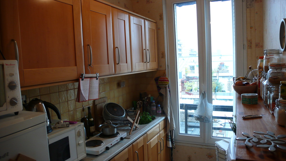 AVANT : À l’autre bout de l’appartement, l’ancienne cuisine (1,80 mètre de large x 2,90 mètres de long) avait bien des défauts ! Outre son look totalement révolu, son plan de travail avait été limité à 50 centimètres de profondeur en raison de l’ouverture de la fenêtre basse. Une largeur insuffisante pour mettre une plaque traditionnelle et qui laissait bien peu de place à Laurence pour cuisiner…