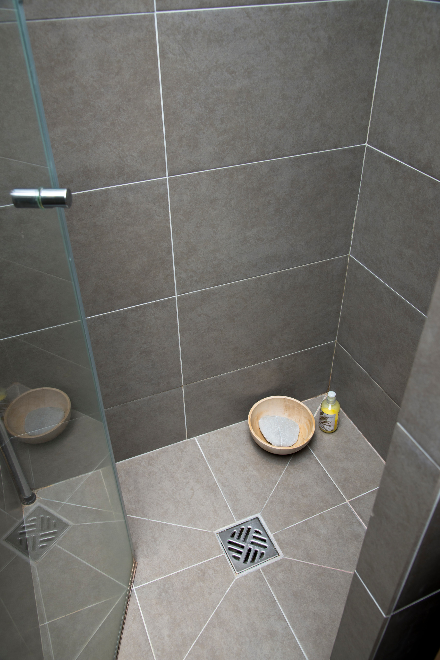APRÈS : Olivier a retravaillé l’espace (1 mètre x 2,30) de façon contemporaine en plaçant une douche à l’italienne carrelée, un meuble vasque suspendu et des toilettes compactes.