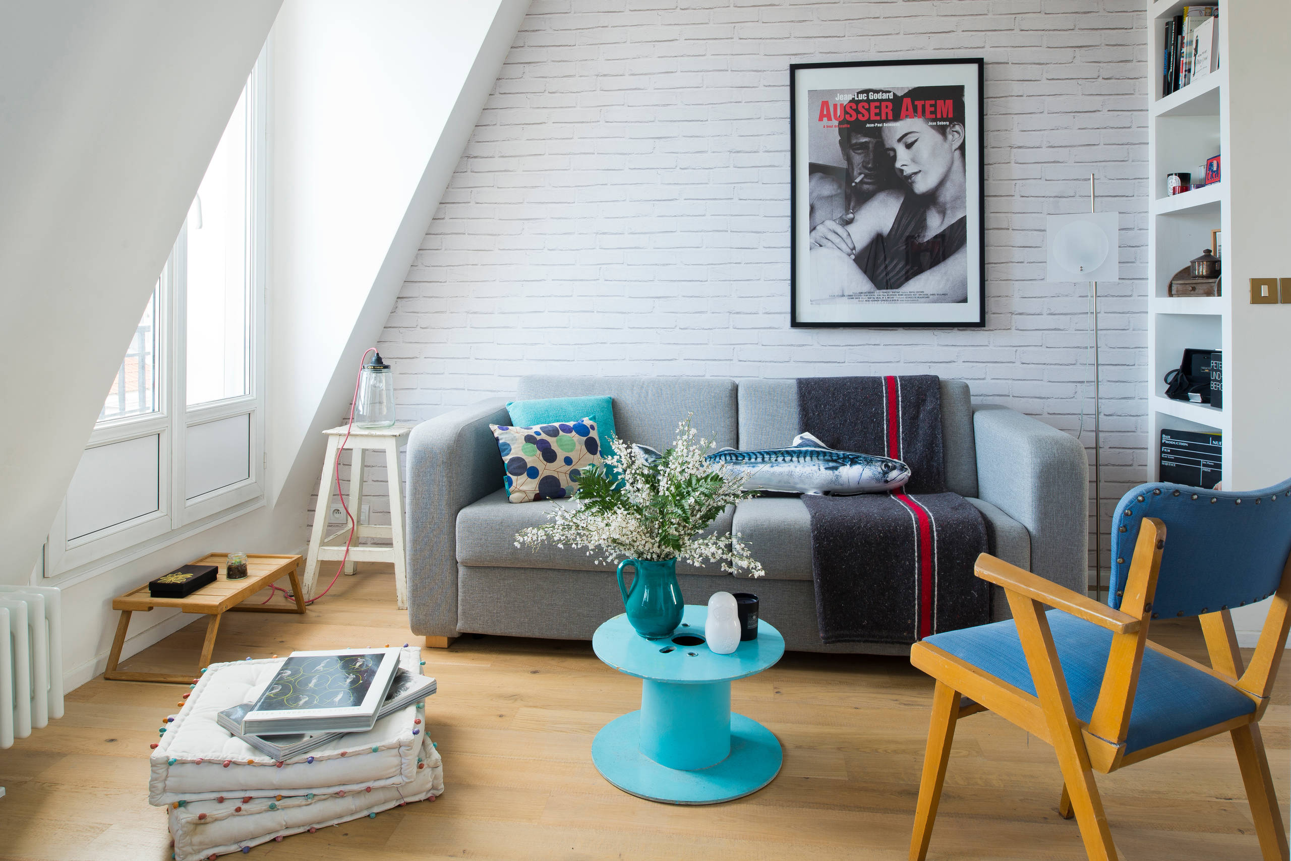 Choc des styles et également des époques. Au canapé convertible contemporain répond un duo de chaises bleues des années 50 ou un tabouret ancien peint en blanc. « Les meilleures décos ne sont pas celles qui restent figées dans un style. Mixer vintage et contemporain rend l’espace vivant. Il faut oser ! », conseille Olivier.