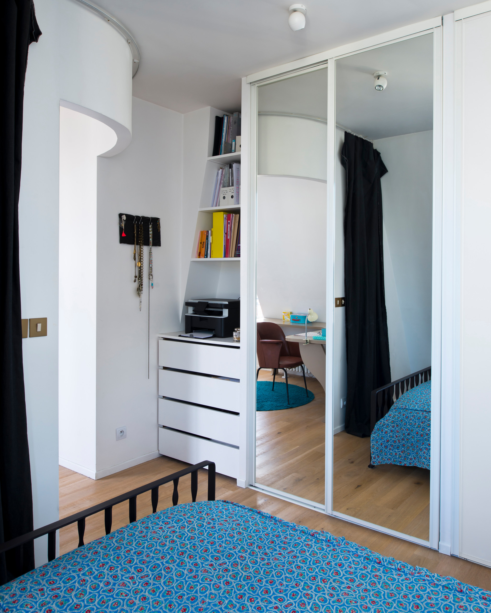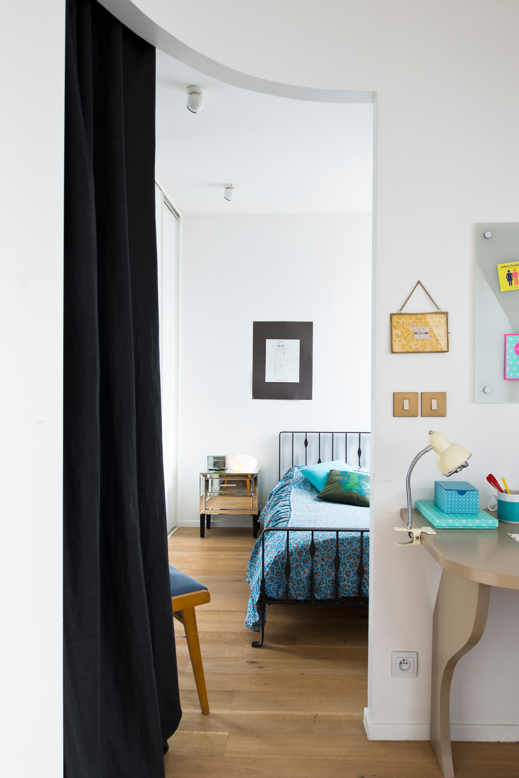 Dans ses aménagements, Olivier veille également à trouver un bon équilibre : au coin salon, plutôt typé masculin, fait face le coin bureau aux formes douces et féminines. Il a été pensé globalement à partir de la porte de la chambre en arc de cercle qui se ferme par un rideau noir.
