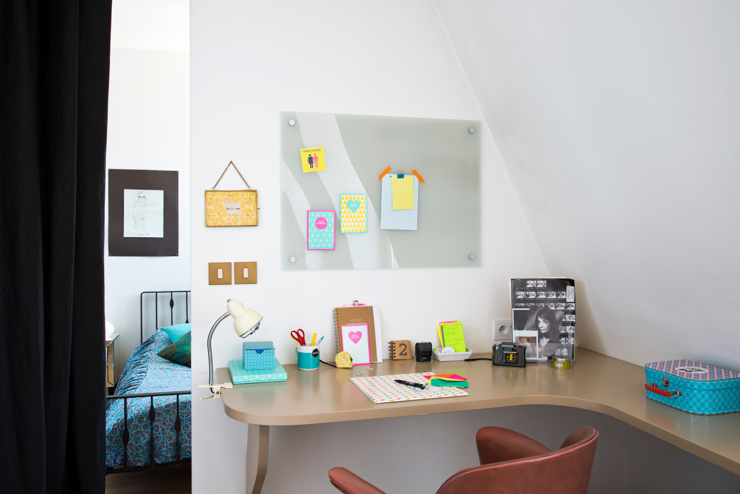 Le bureau est surplombé par un tableau magnétique en verre : « J’ai découvert ce produit en aménageant des bureaux. C’est comme un tableau blanc sur lequel on peut écrire et afficher, mais dans une version esthétique. »