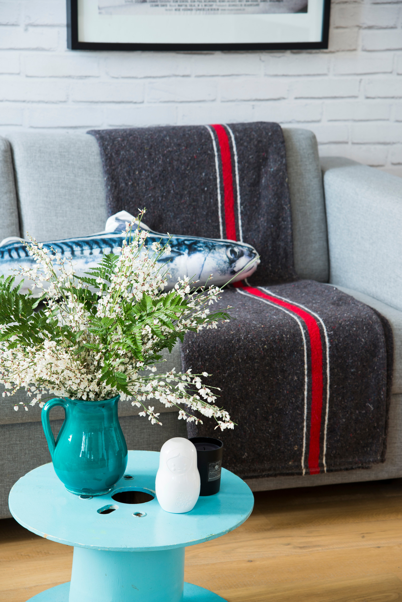 Si le blanc des murs et le miel du sol créent une palette sobre, inspirée du style finlandais qu’apprécie la propriétaire, des touches de bleu vif égaient la déco ici et là. Une grande affiche de cinéma et un sac de voyage en lin aux inscriptions en néerlandais rappellent le goût prononcé de Laurence pour les voyages et sont un clin d’œil au pays de son enfance.