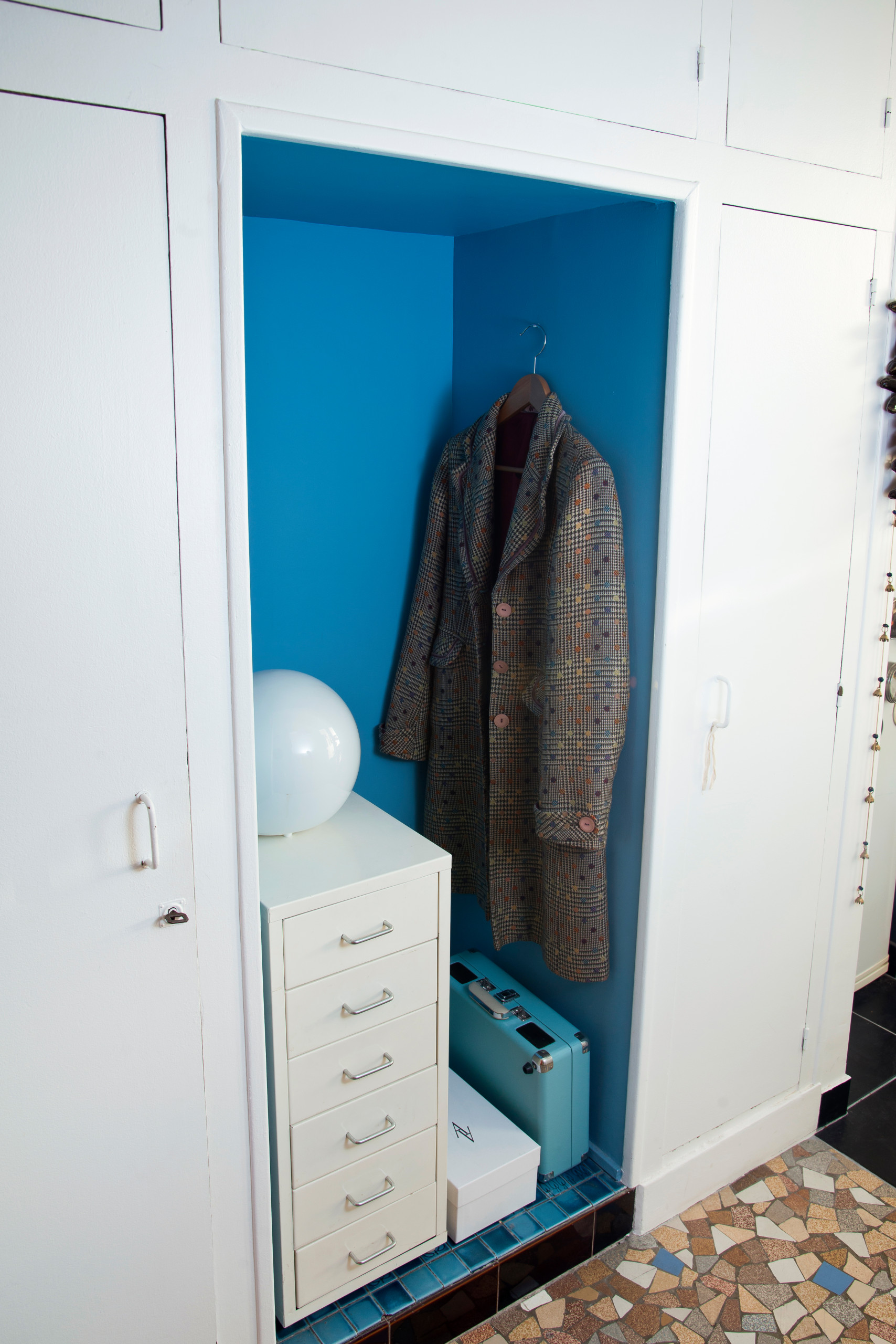 APRÈS : Le bleu, couleur préférée de Laurence, habille désormais la niche face à la porte d’entrée, lui donnant du caractère. Cette dernière est entourée de placards sur mesure datant des années 50. En bon état, ils ont été gardés tels quels. Celui de gauche sert de vestiaire. Celui de droite abrite les affaires de repassage et l’aspirateur. Au-dessus, de petits placards renferment les valises et sacs de voyage.