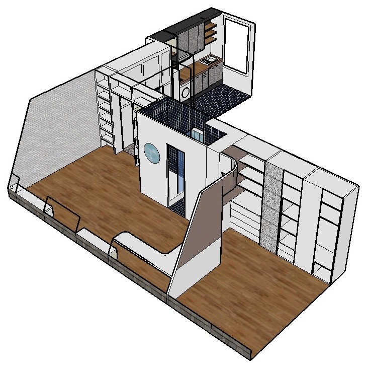 Voici le plan de l’appartement en 3D après travaux. La porte d’entrée se situe juste à gauche de la cuisine (la pièce tout au fond du plan) dans un petit sas. La pièce que l’on distingue à droite, au premier plan, est la chambre de Laurence, longée de placards.