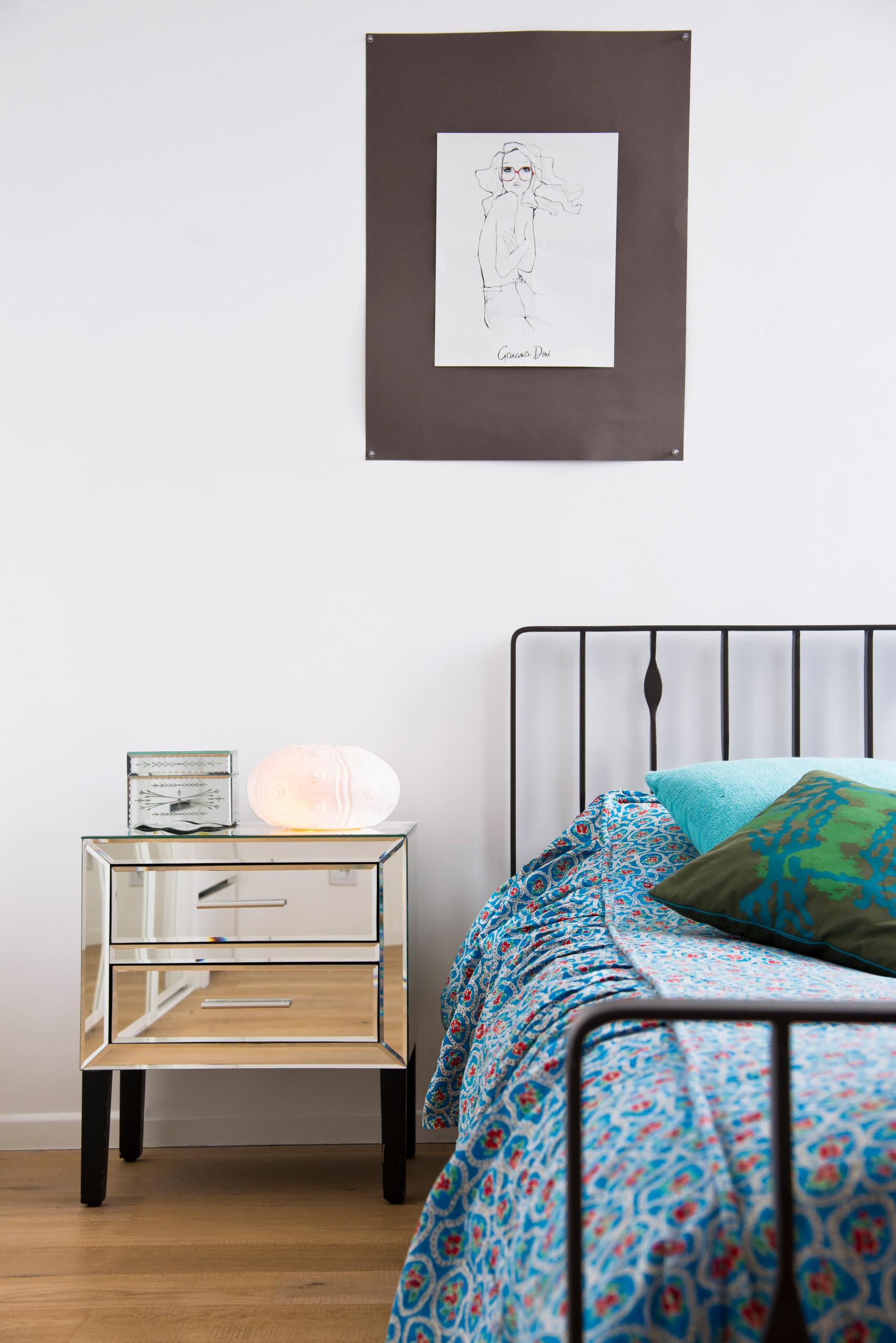 Cette table de nuit en miroir et la boîte assortie, très féminines, appartenaient déjà à l’actrice mais n’étaient pas mises en valeur. Elles participent dorénavant activement à la déco de la chambre, surplombées par un dessin de la blogueuse de mode Garance Doré. Laurence a rhabillé son lit en métal d’un dessus-de-lit vintage, confectionné dans une étoffe de style Liberty, fidèle au code couleurs bleu et rouge du salon.