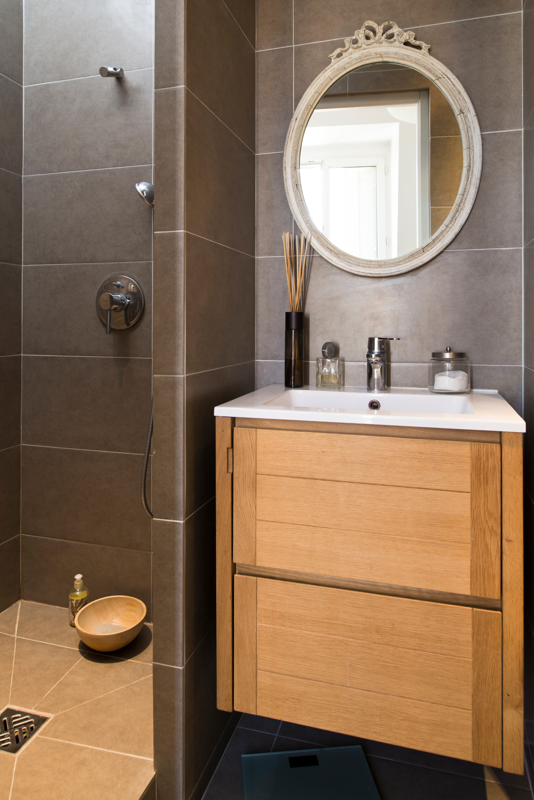 La palette de couleurs a été inspirée là encore par le carrelage de l’entrée. Du grès cérame chocolat couvre la douche. Le meuble vasque est en chêne miel.