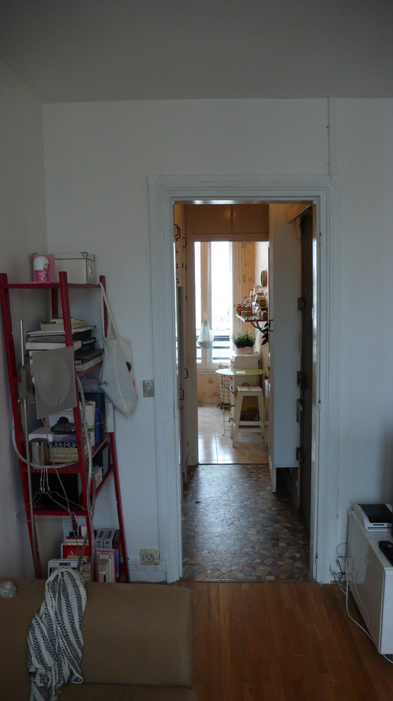 AVANT : Vue du sas d’entrée avant travaux. Au fond se trouve la cuisine, et derrière nous, la pièce de vie.