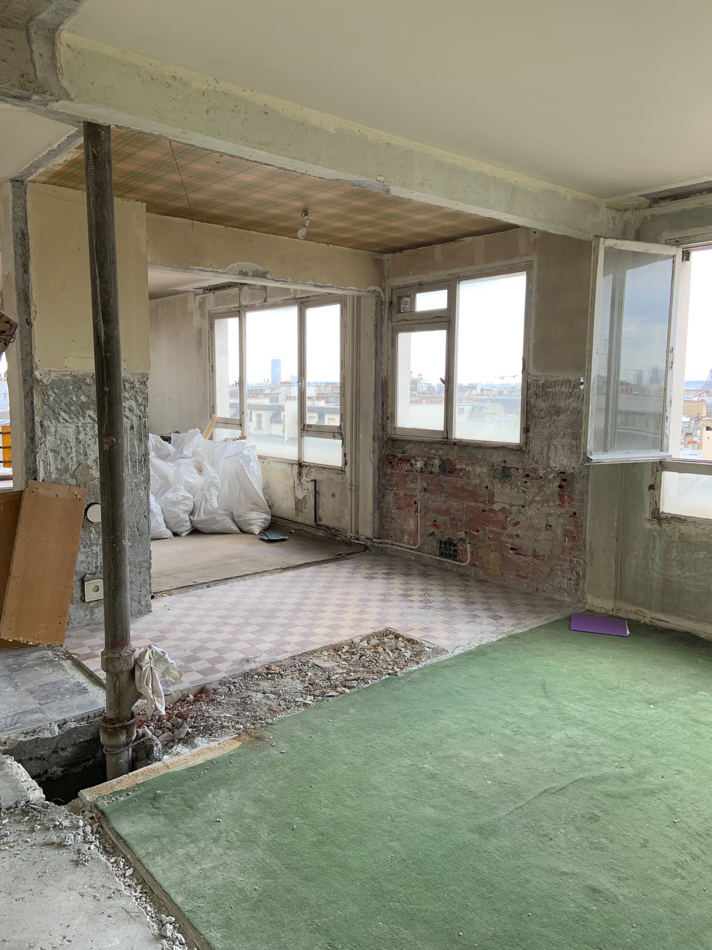 Avant. Au dixième étage d’une résidence des Batignolles, le grand trois pièces de cette famille offre une magnifique vue à 180° sur le nord-est de la Capitale, de La Défense à Montmartre. En acquérant l’appartement jumeau, ces trentenaires complètent ce point de vue à 360° avec un panorama qui s’étend du Panthéon à la Tour Eiffel.
