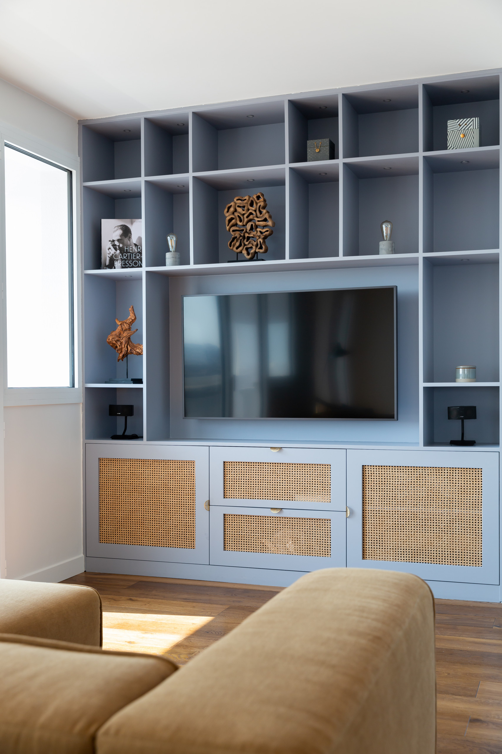 Un meuble télé bibliothèque en médium laqué et inserts de cannage a été réalisé sur mesure par un menuisier. Ce type de meuble esthétique permet de suspendre le téléviseur et de cacher tous les fils disgracieux.