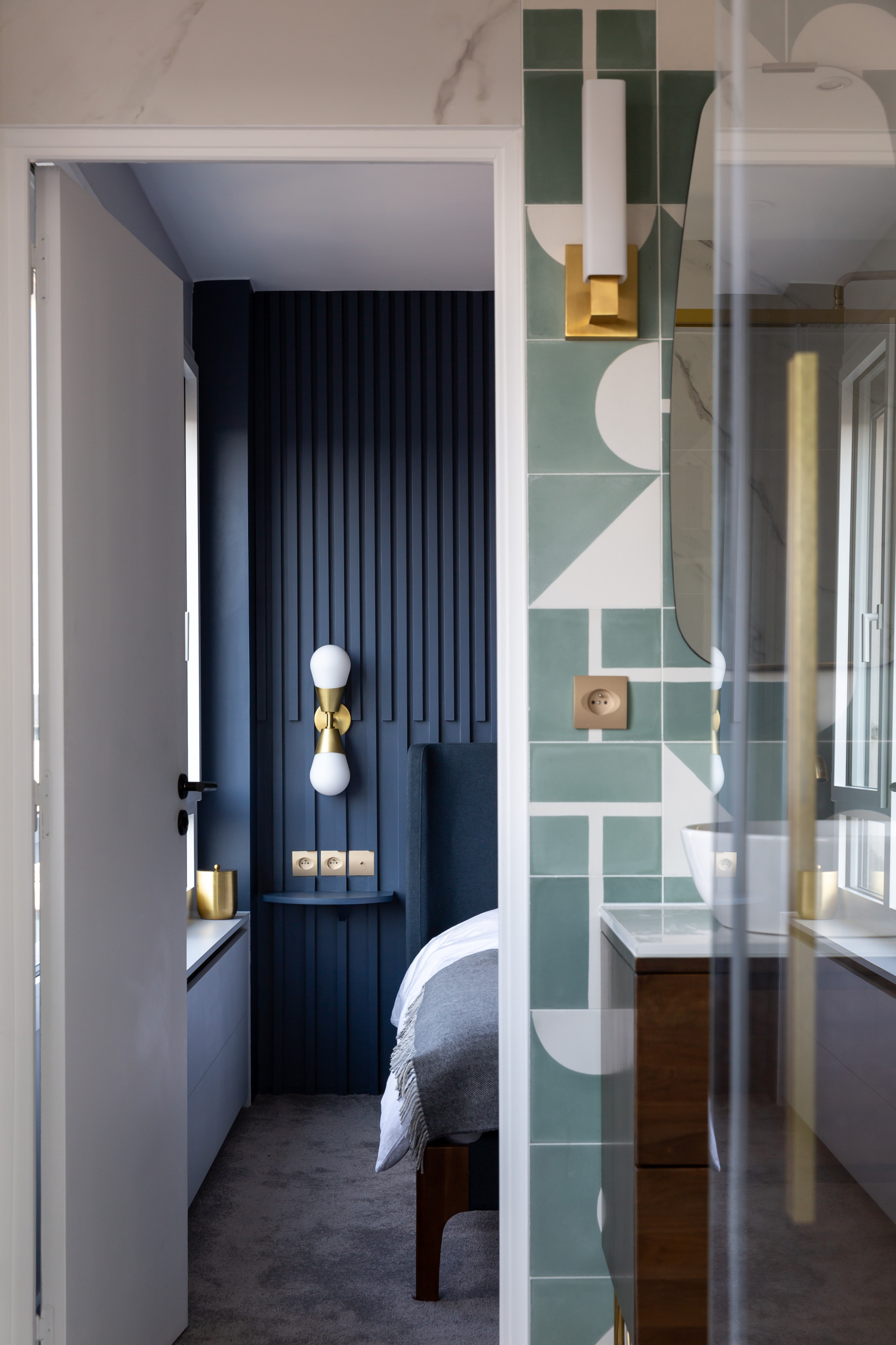 La salle d’eau sert donc de sas pour entrer dans la chambre. Afin de rester dans l’esprit Streamline moderne, ses murs ont été parés d’un carrelage style Art déco, calepiné sur mesure par l’architecte d’intérieur. « J’adore ces moments créatifs dans mon métier », nous souffle-t-elle.