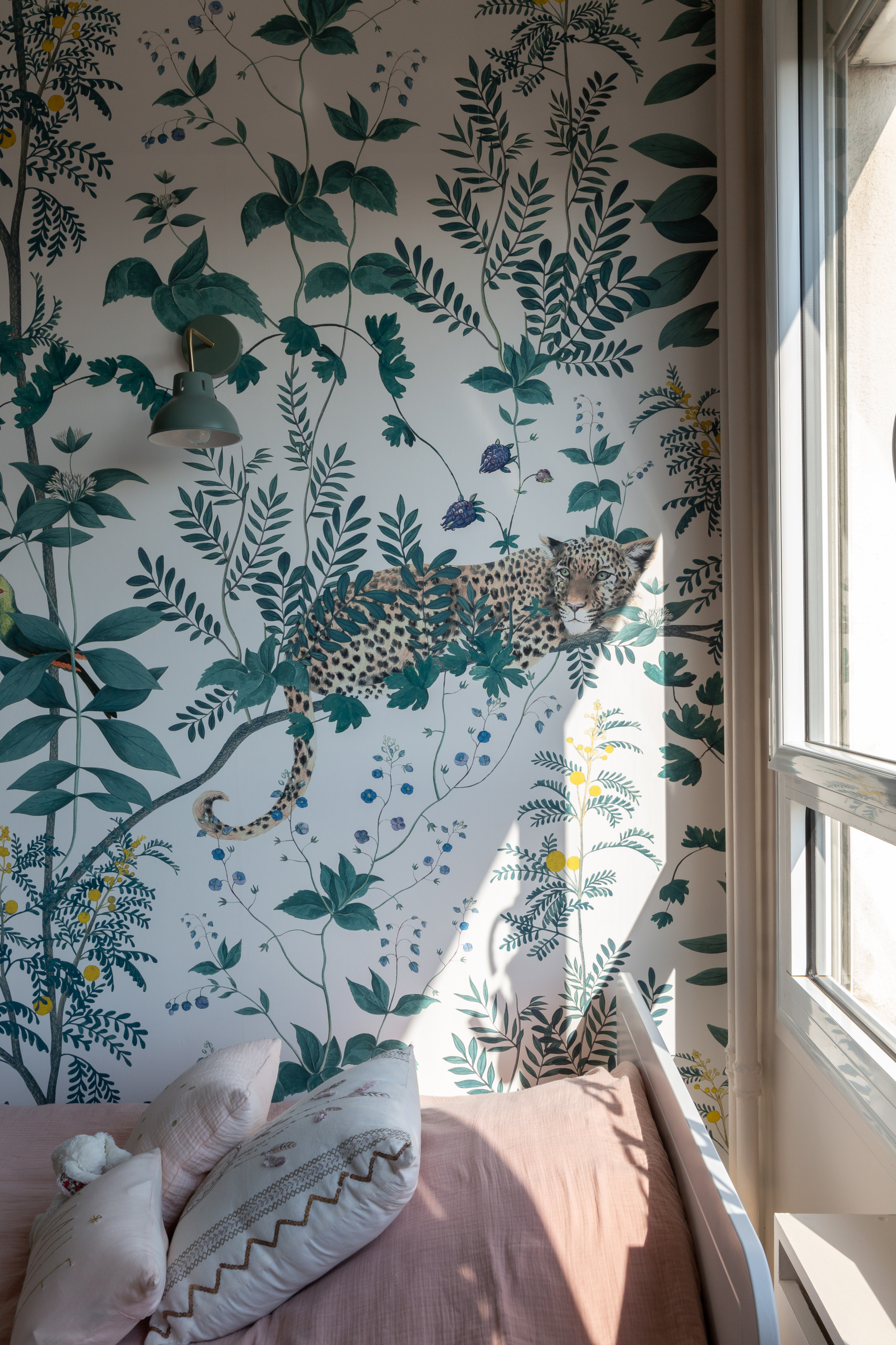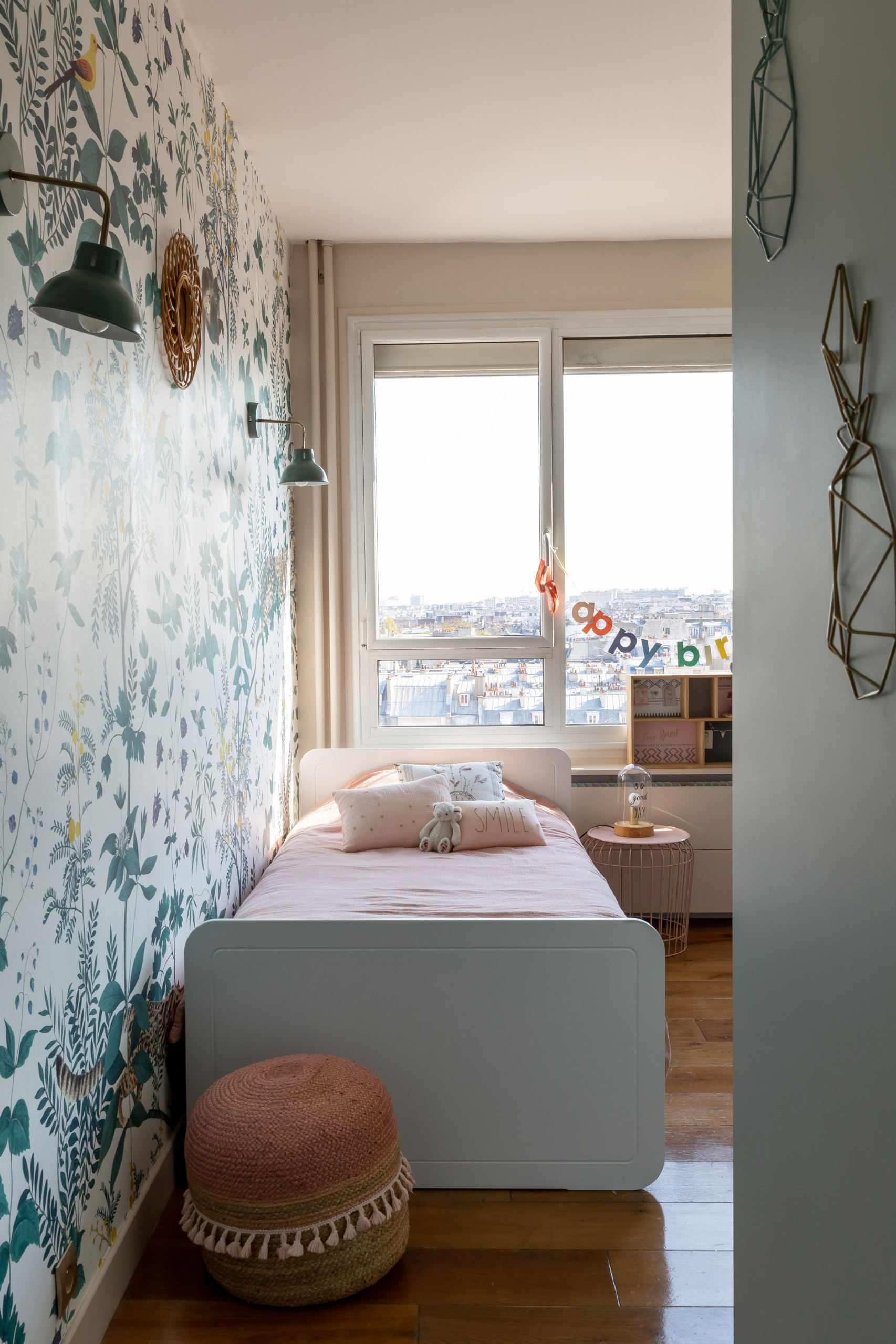 Face au bureau et ses rangements sur mesure, le lit s’appuie sur un pan de mur décoré d’un papier peint fleuri.